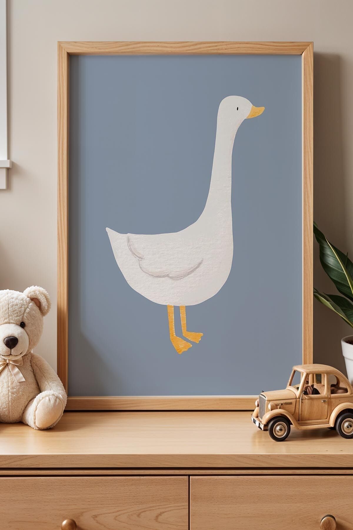 DOĞAL AHŞAP - Mavi Arka Planlı Yürüyen Kaz Çocuk Odası Ahşap Çerçeveli Duvar Tablosu