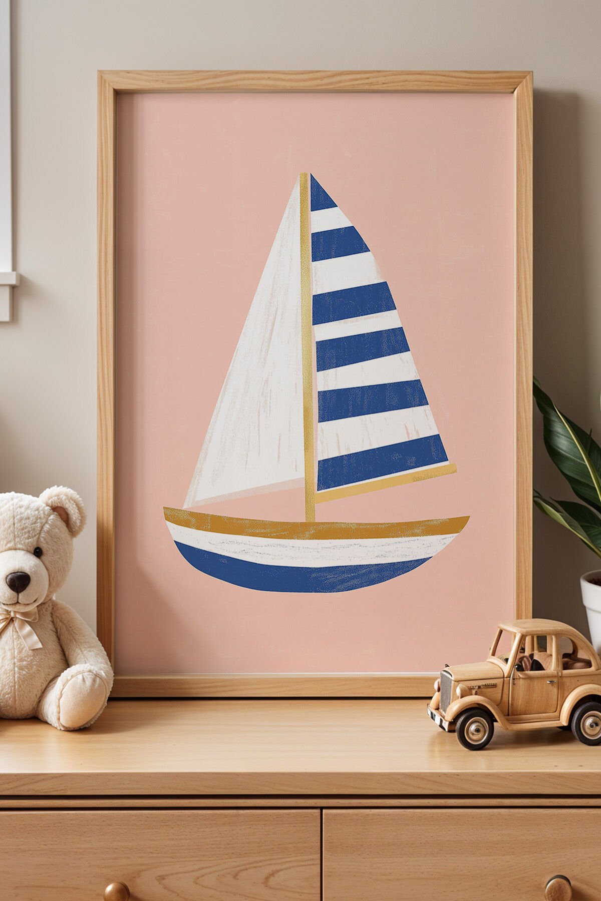 DOĞAL AHŞAP - Mavi Çizgili Yelken Çocuk Odası Ahşap Çerçeveli Duvar Tablosu