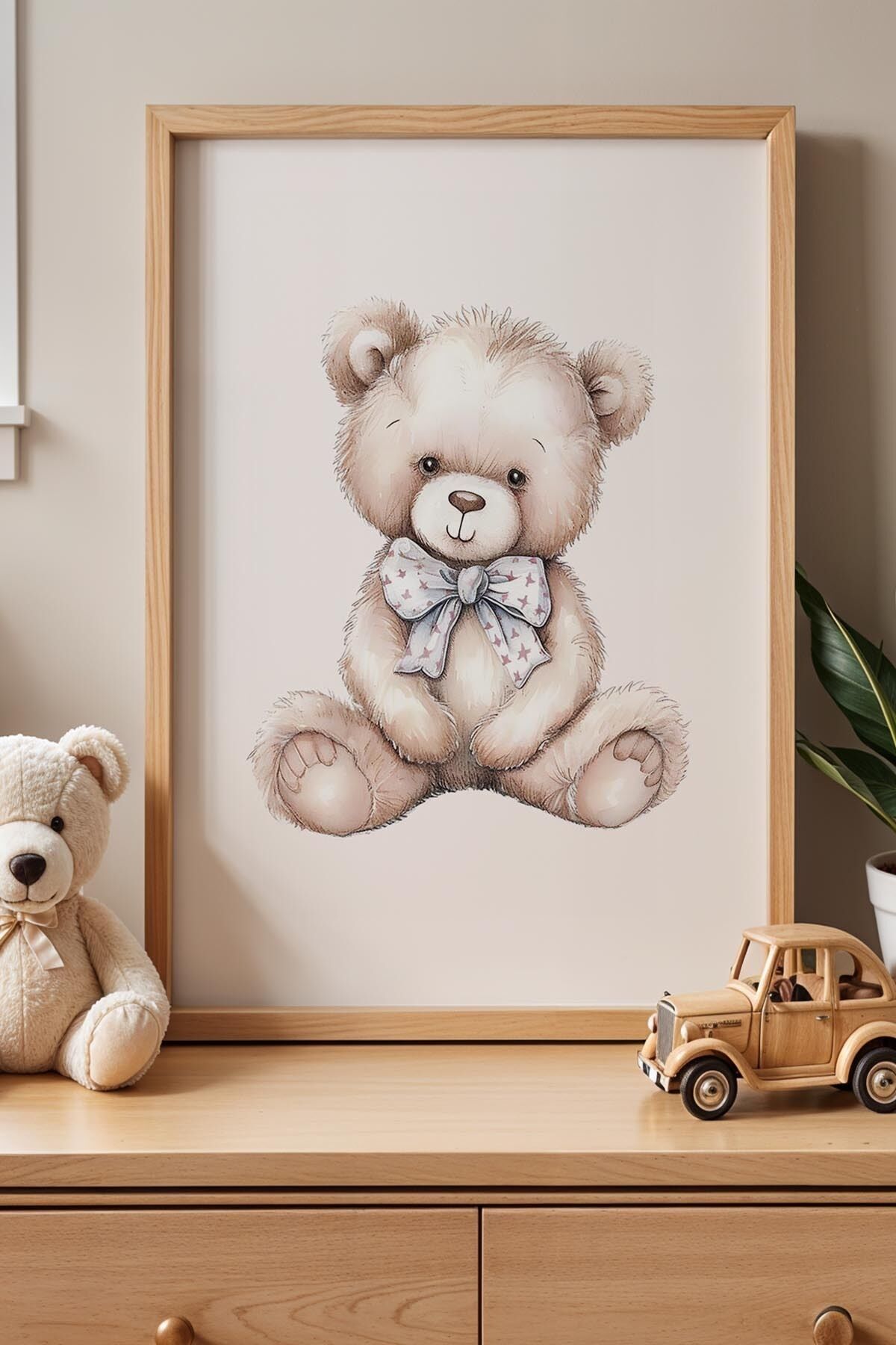 DOĞAL AHŞAP - Mavi Fiyonklu Ayıcık Çocuk Odası Ahşap Çerçeveli Duvar Tablosu