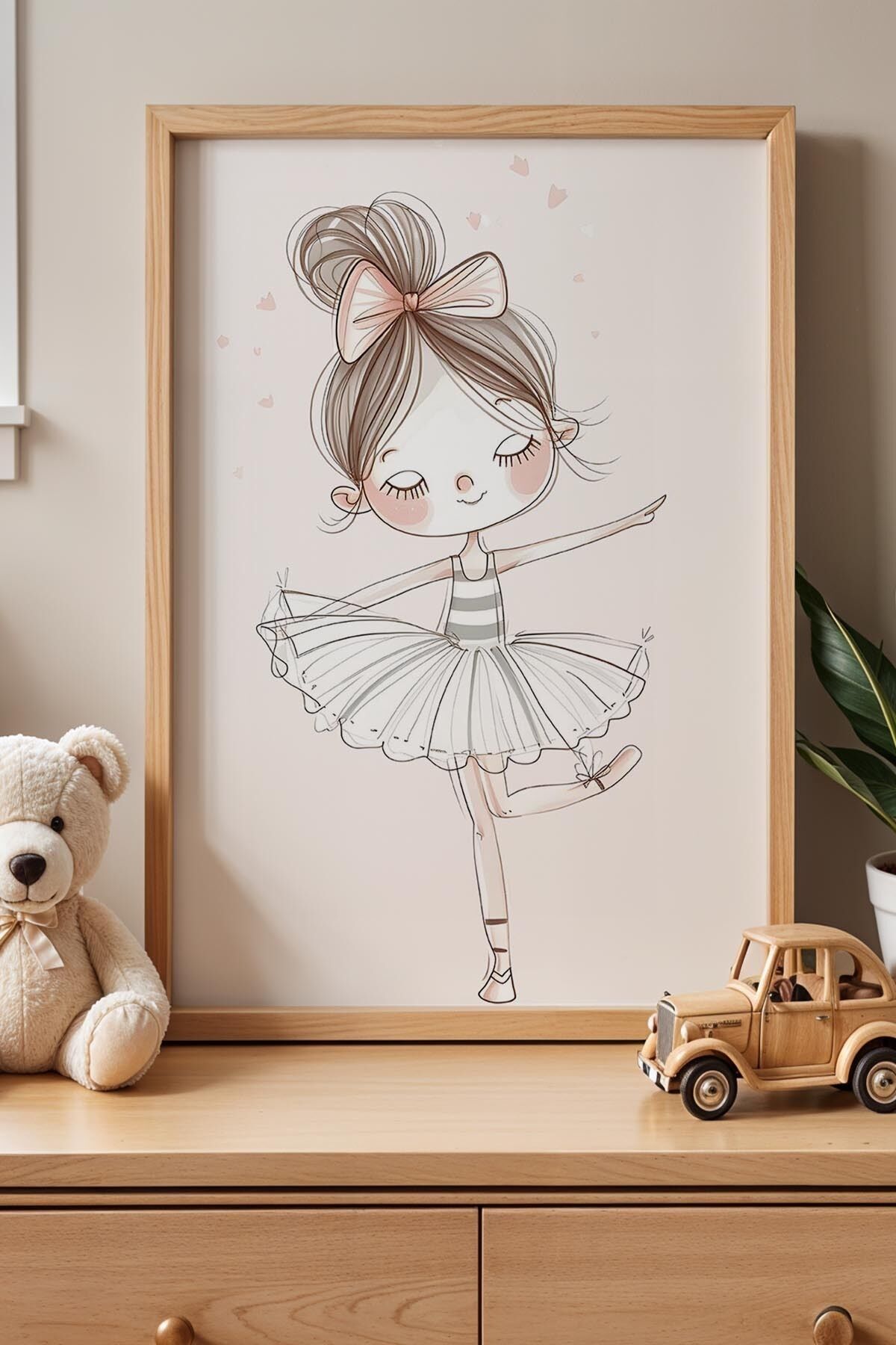 DOĞAL AHŞAP - Minimalist Balerin Çizimi Çocuk Odası Ahşap Çerçeveli Duvar Tablosu