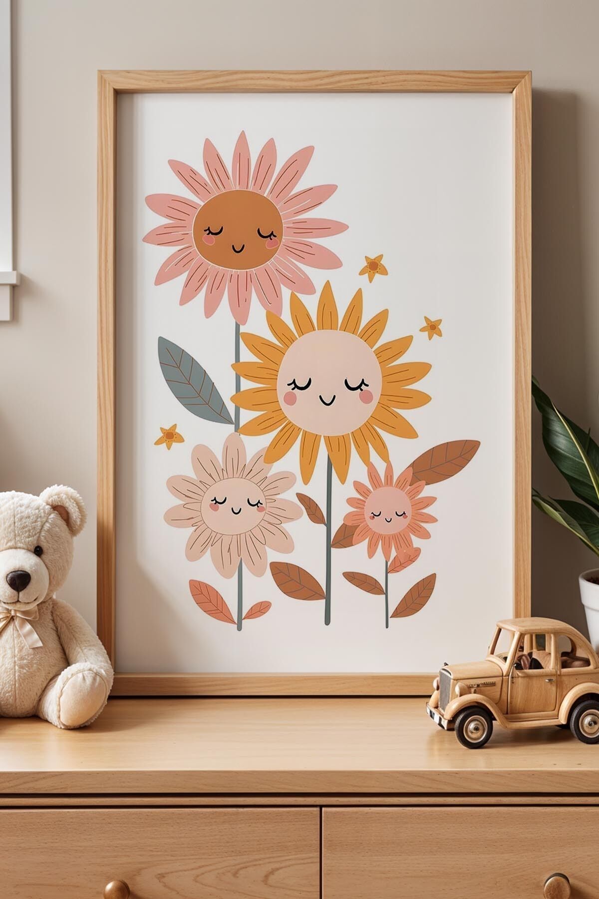DOĞAL AHŞAP - Minimalist Çizim Papatyalar Çocuk Odası Ahşap Çerçeveli Duvar Tablosu