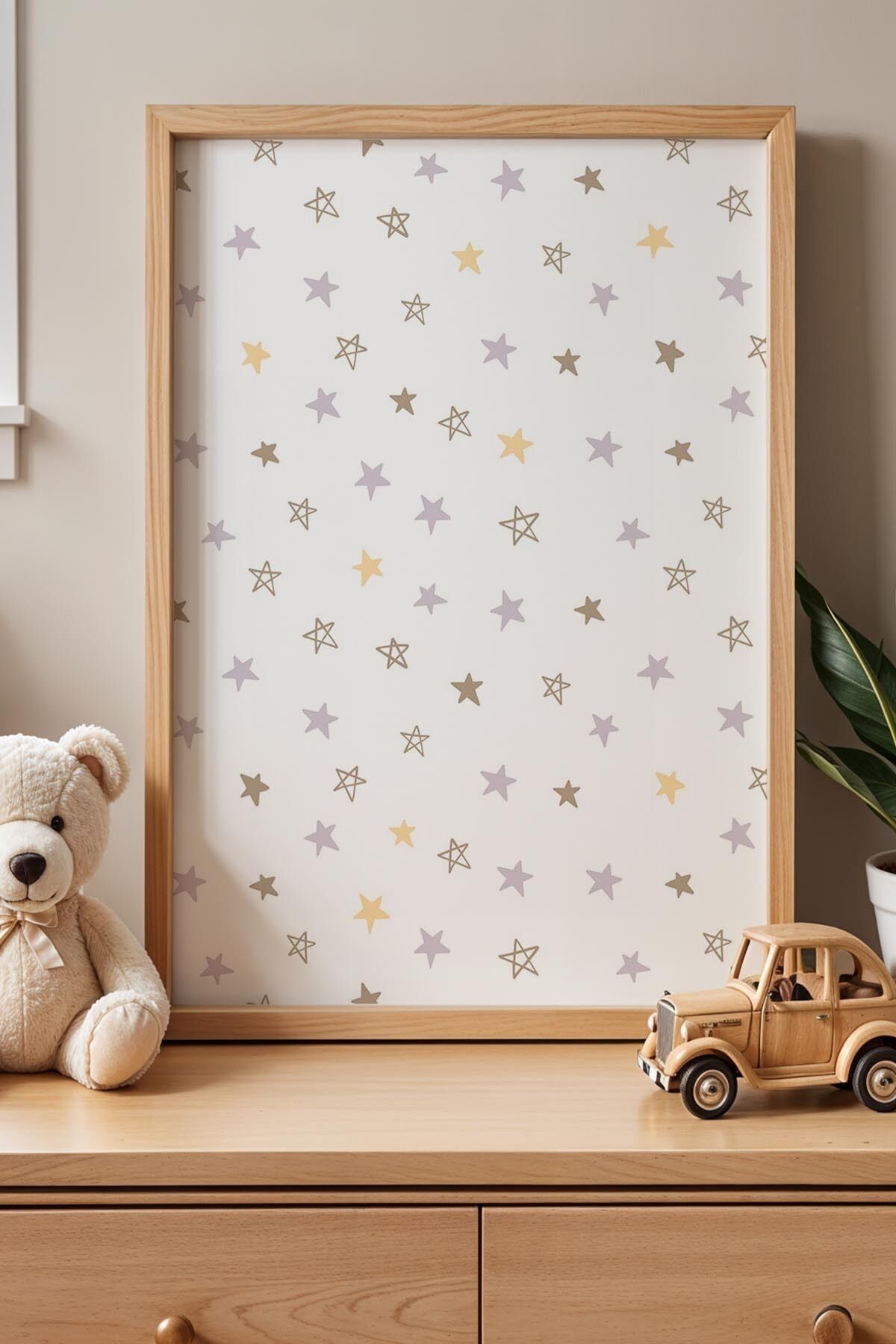 DOĞAL AHŞAP - Minimalist Çizim Yıldızlar Çocuk Odası Ahşap Çerçeveli Duvar Tablosu