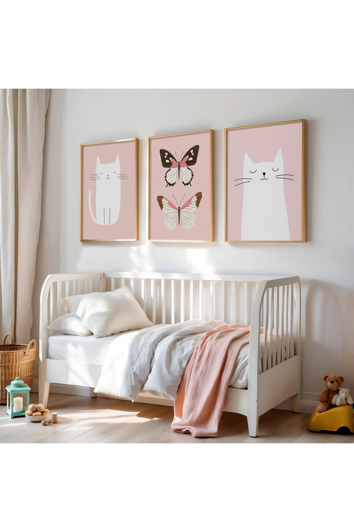 DOĞAL AHŞAP - Minimalist Kedi ve Kelebek Tasarımlı Doğal Ahşap Çerçeveli Çocuk Odası Tablo Seti