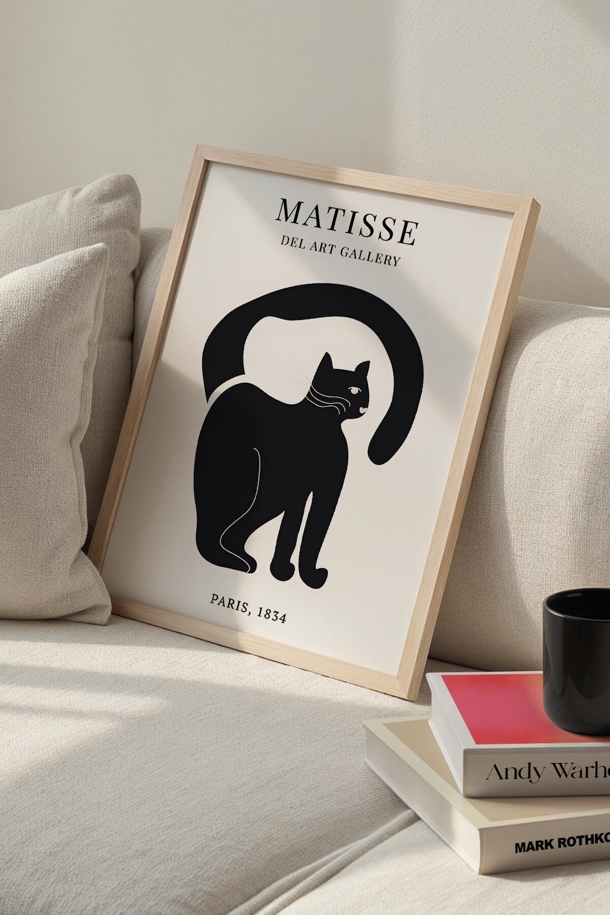 DOĞAL AHŞAP - Minimalist Siyah Kedi Bohem Tarzı Soyut Sanat Matisse Doğal Ahşap Çerçeveli Duvar Tablosu