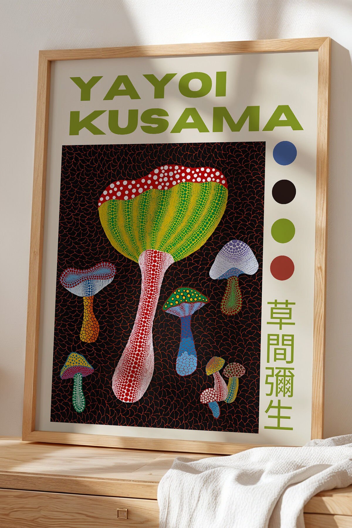 DOĞAL AHŞAP - Modern Japandi Dekor: Doğal Ahşap Çerçeveli Noktalı Mantar Sanat Tablosu