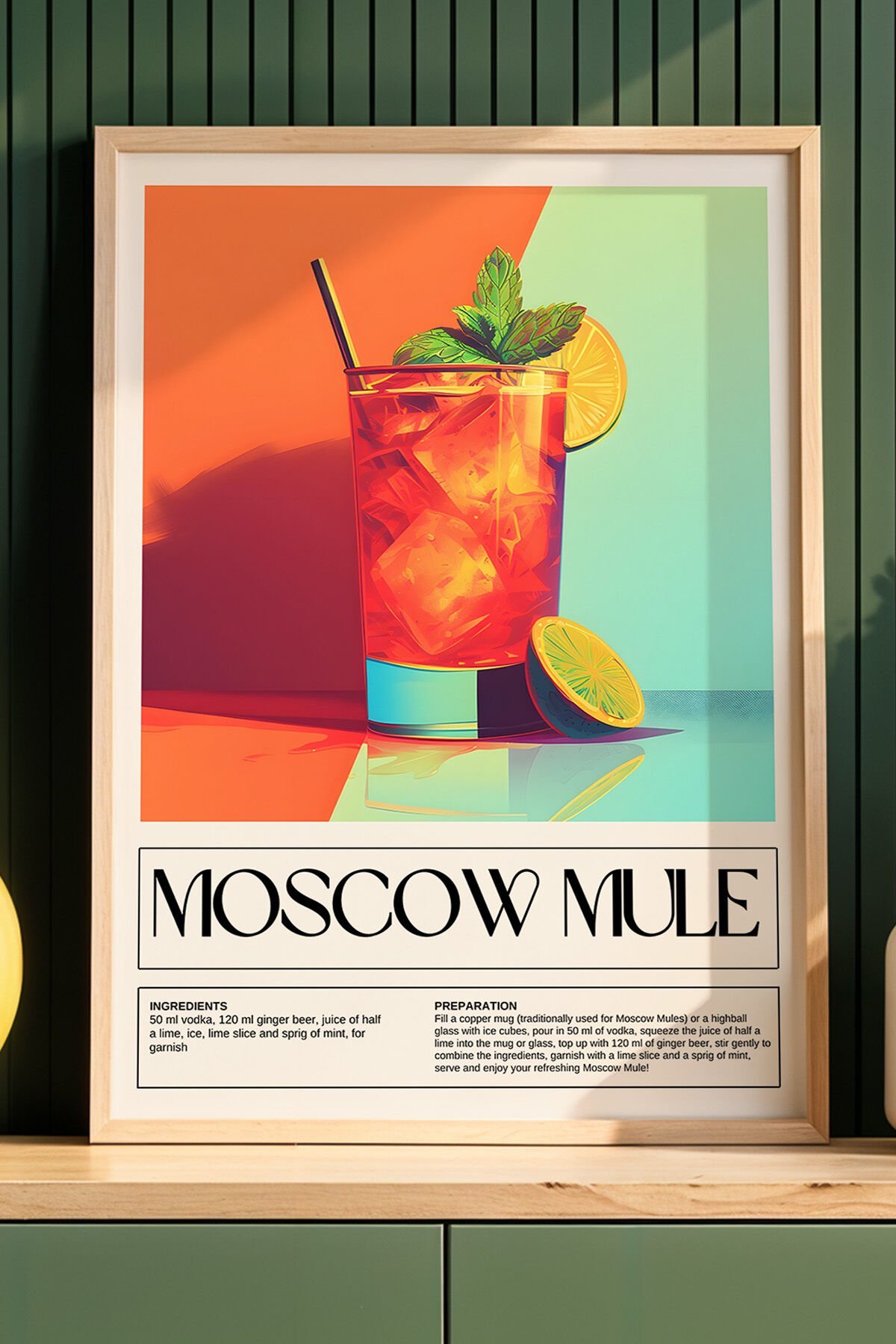 DOĞAL AHŞAP - Moscow Mule Tarifi Renkli İllüstrasyon Mutfak Ahşap Çerçeveli Duvar Tablosu