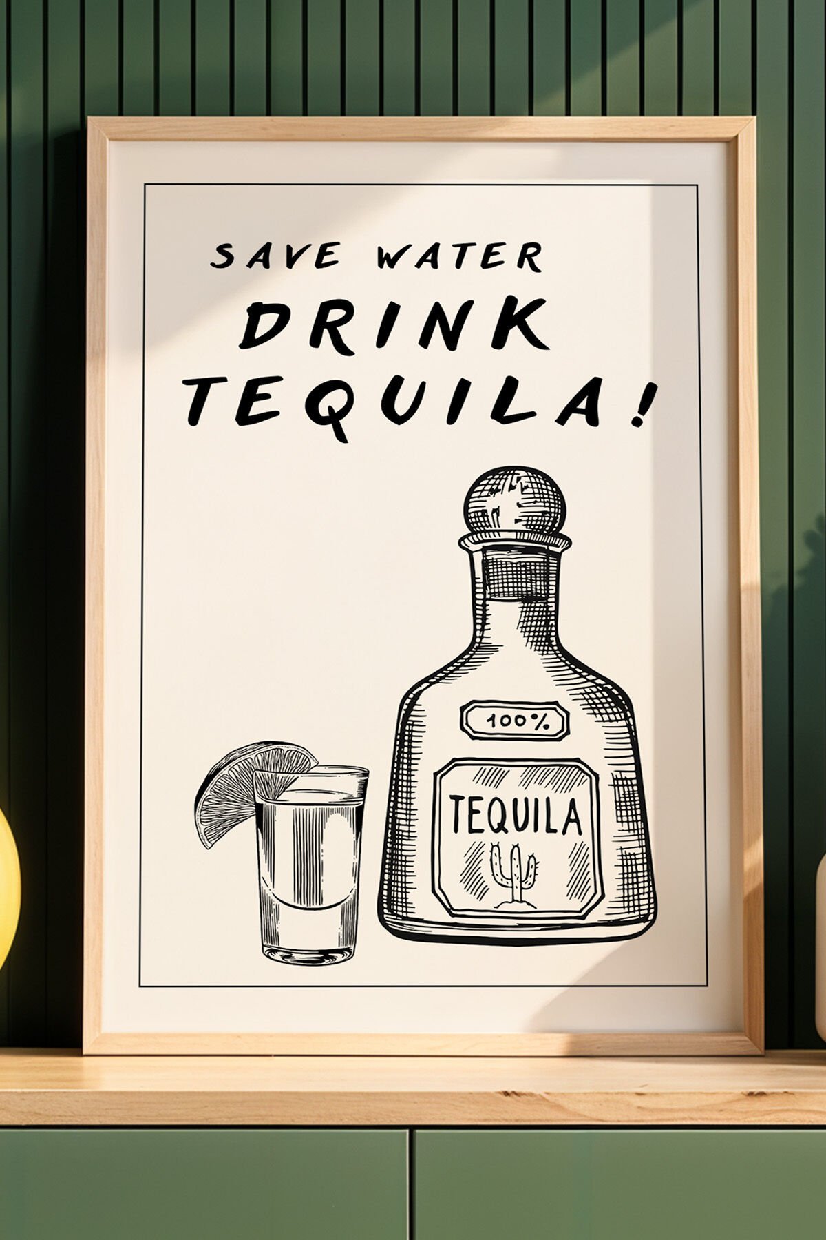 DOĞAL AHŞAP - Mutfak Dekoru Save Water Drink Tequila Yazılı Ahşap Çerçeveli Duvar Tablosu