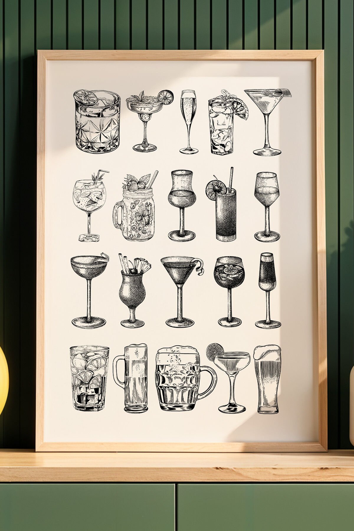 DOĞAL AHŞAP - Mutfak İçin Kokteyl Bardakları İllüstrasyonlu Ahşap Çerçeveli Duvar Tablosu