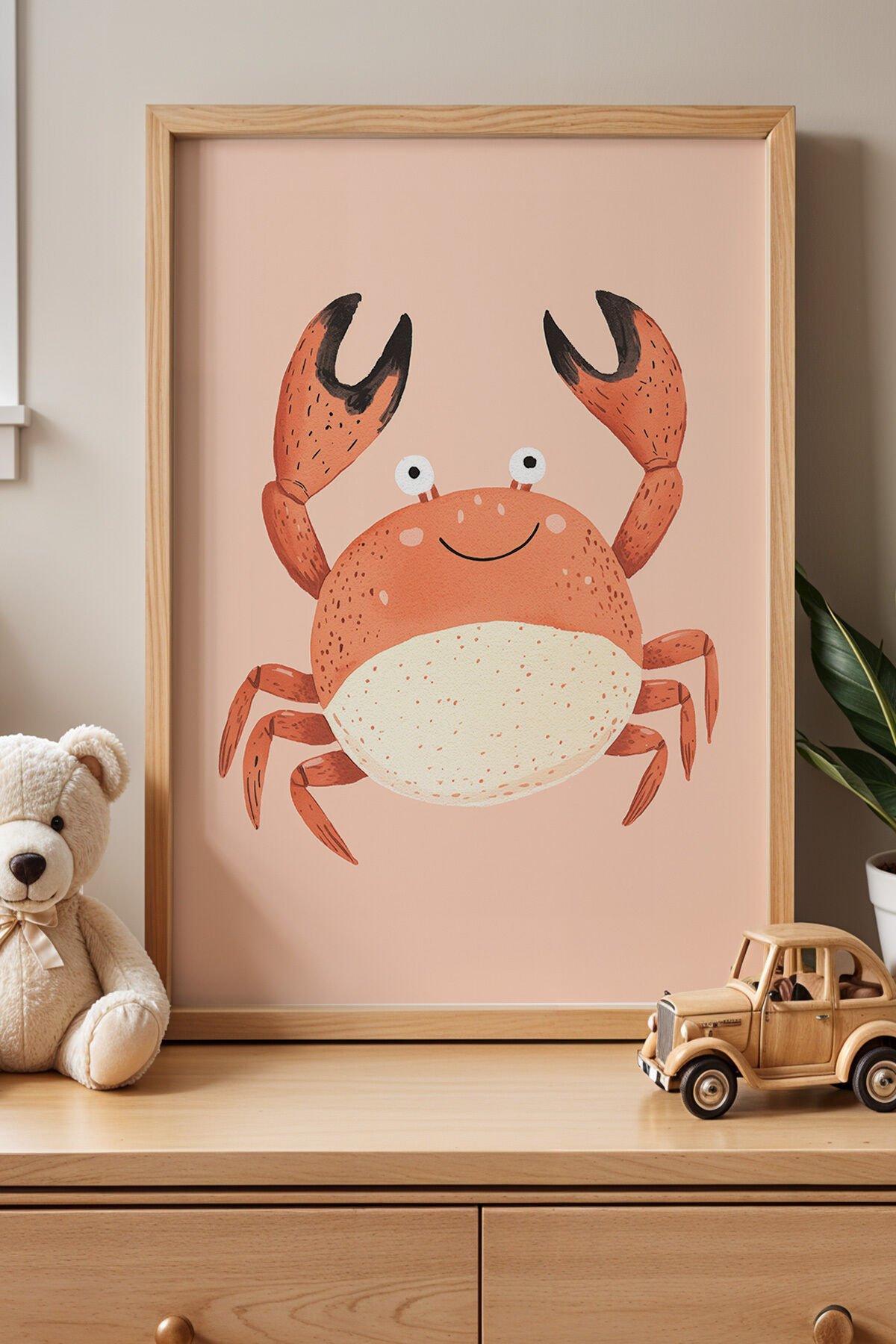 DOĞAL AHŞAP - Neşeli Yengeç ve Deniz Dünyası Doğal Ahşap Çerçeveli Çocuk ve Bebek Odası Tablosu