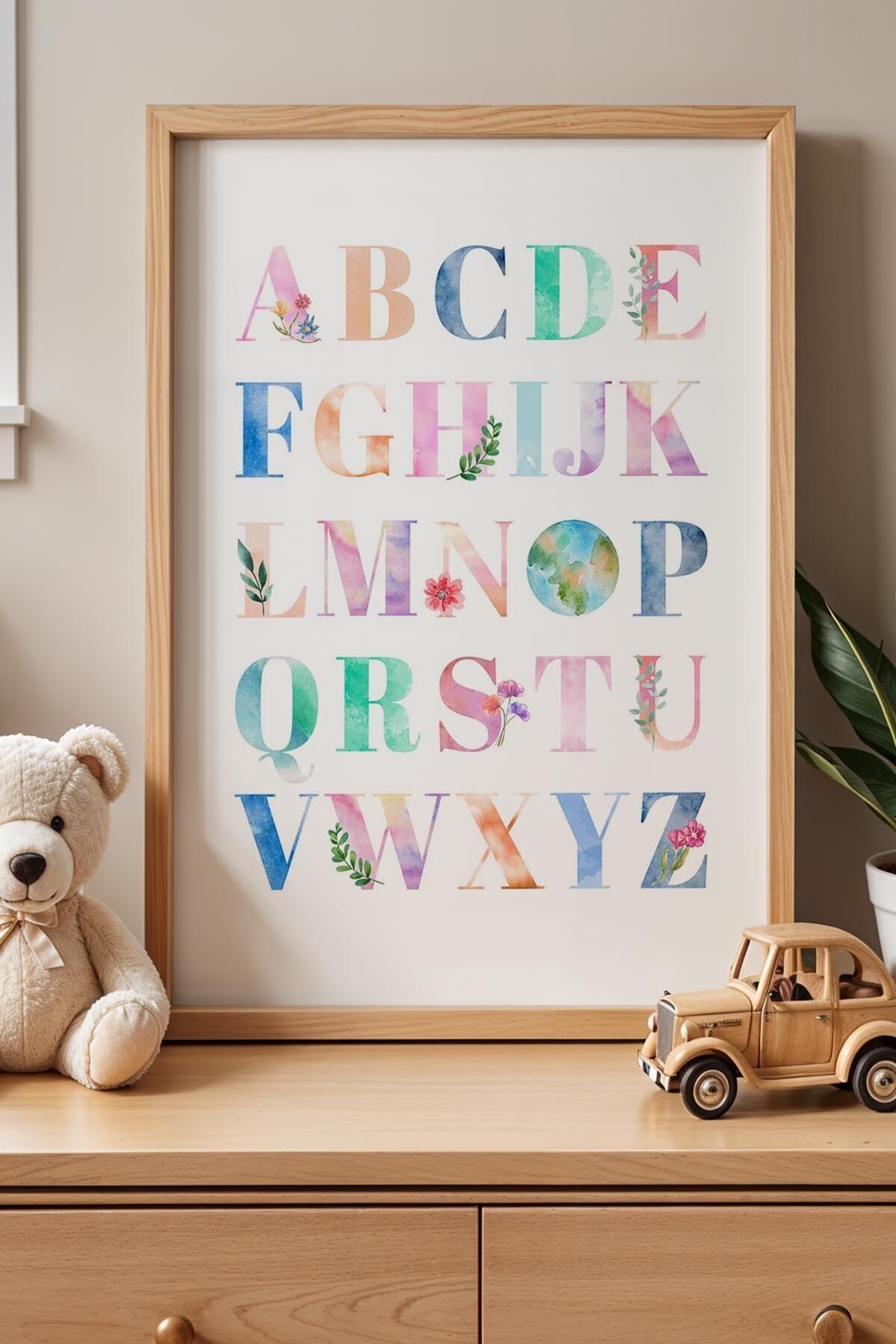 DOĞAL AHŞAP - Öğretici İngilizce Alfabe Çocuk Odası Ahşap Çerçeveli Duvar Tablosu