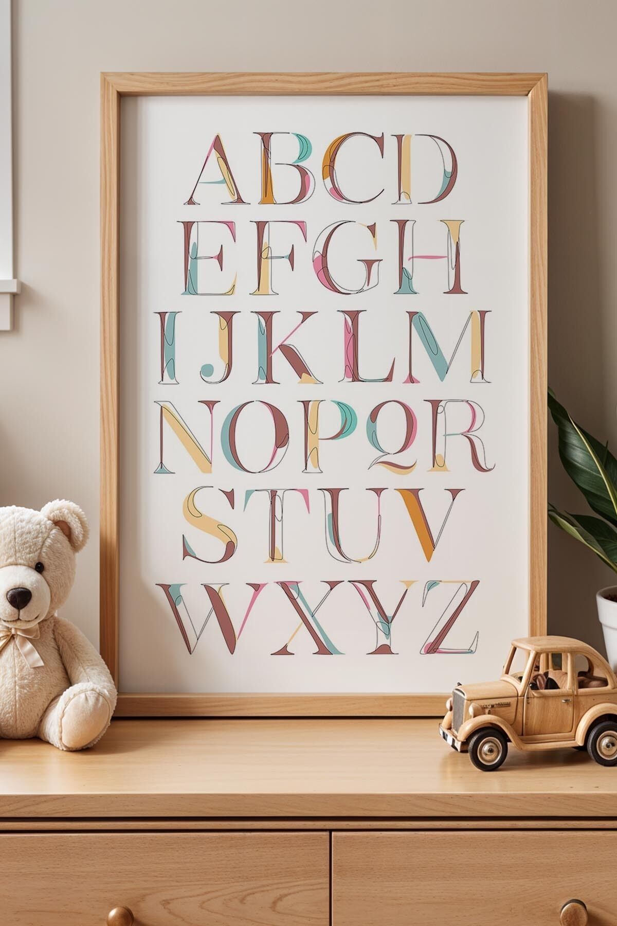 DOĞAL AHŞAP - Öğretici İngilizce Alfabe Çocuk Odası Ahşap Çerçeveli Duvar Tablosu