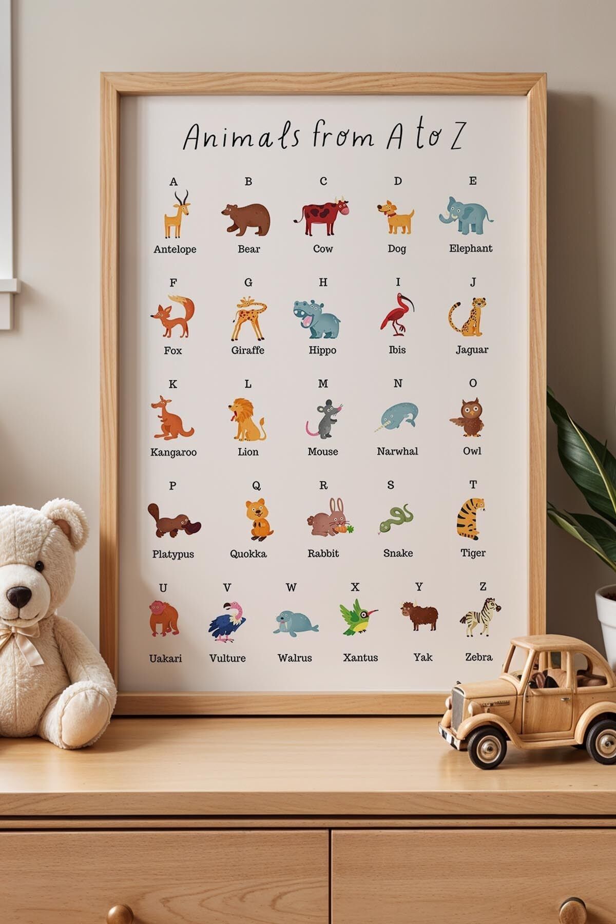 DOĞAL AHŞAP - Öğretici İngilizce Hayvan İsimleri Çocuk Odası Ahşap Çerçeveli Duvar Tablosu