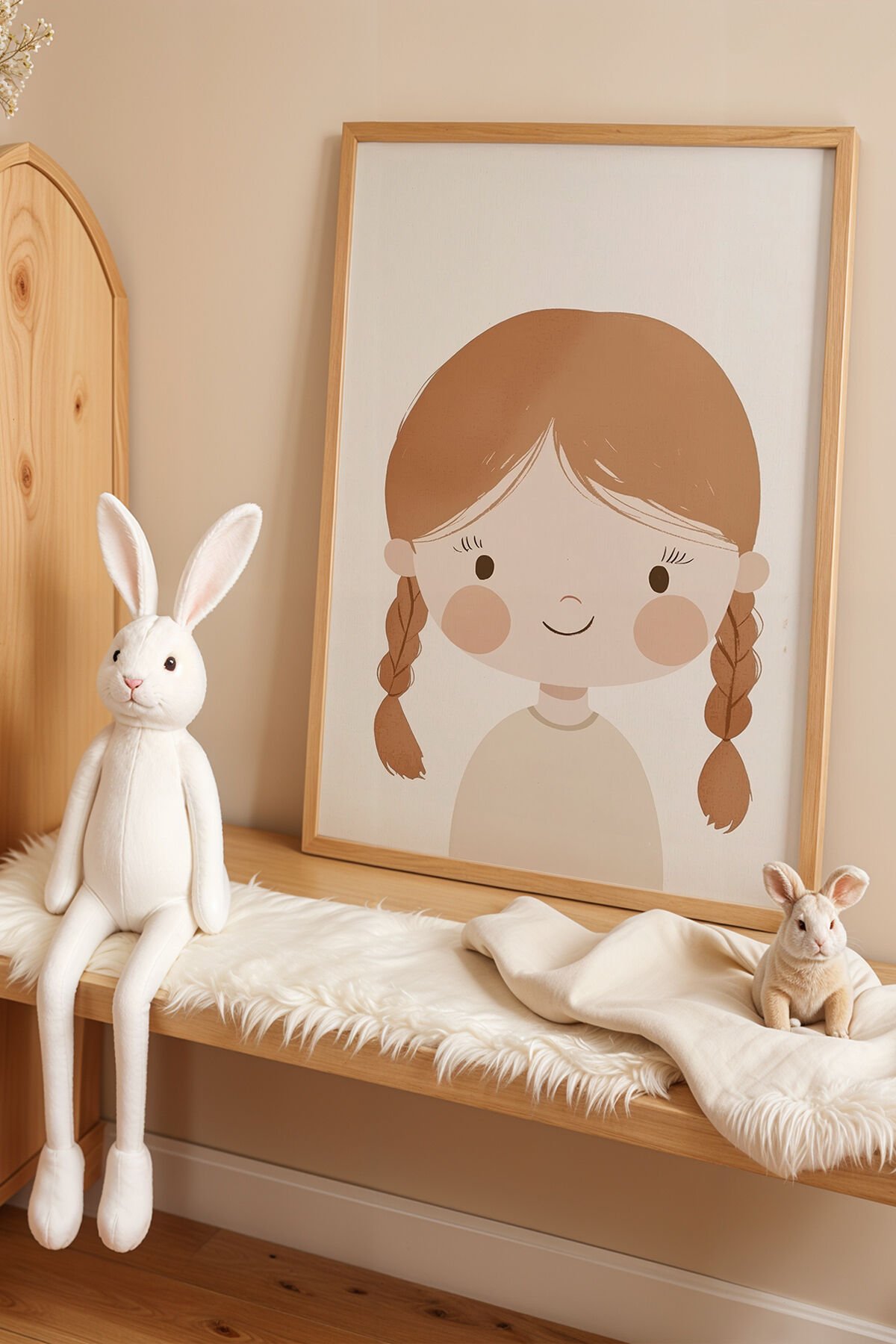 DOĞAL AHŞAP - Örgülü Saçlı Sevimli Kız - Doğal Ahşap Çerçeveli Çocuk ve Bebek Odası Tablosu