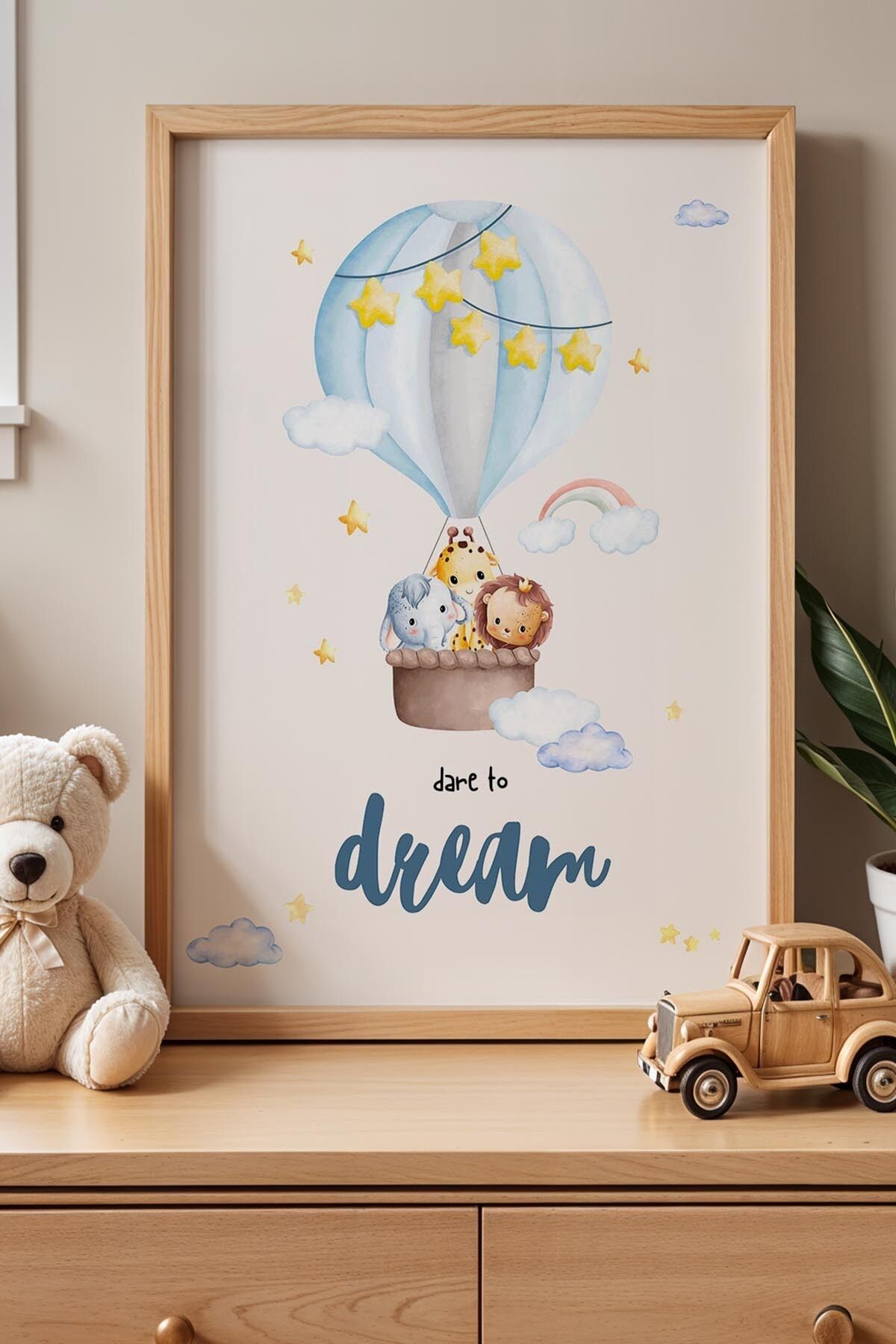 DOĞAL AHŞAP - Orman Hayvanlarıyla Balon Macerası Çocuk Odası Ahşap Çerçeveli Duvar Tablosu