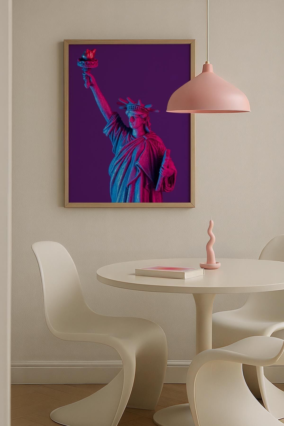 DOĞAL AHŞAP - Özgürlük Heykeli Neon Trendy Maksimalist Sanatı Ahşap Çerçeveli Duvar Tablosu