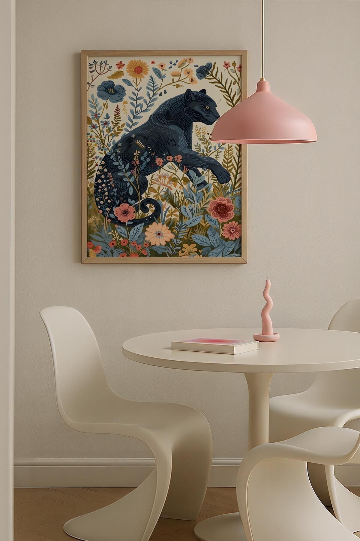 DOĞAL AHŞAP - Panter ve Çiçekler Lacivert Maksimalist Sanatı Ahşap Çerçeveli Duvar Tablosu