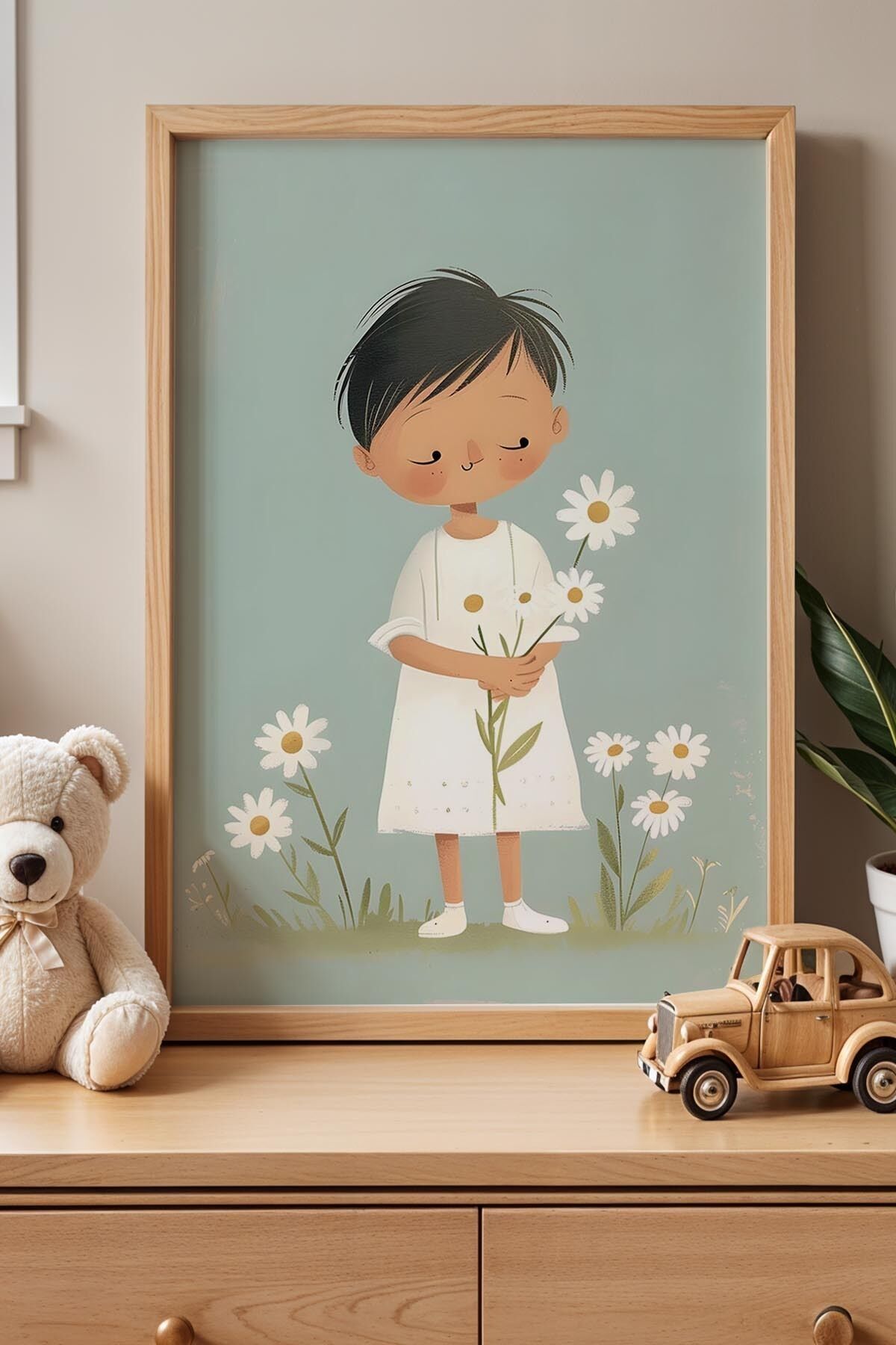 DOĞAL AHŞAP - Papatya Tutan Çocuk İllüstrasyonu Çocuk Odası Ahşap Çerçeveli Duvar Tablosu