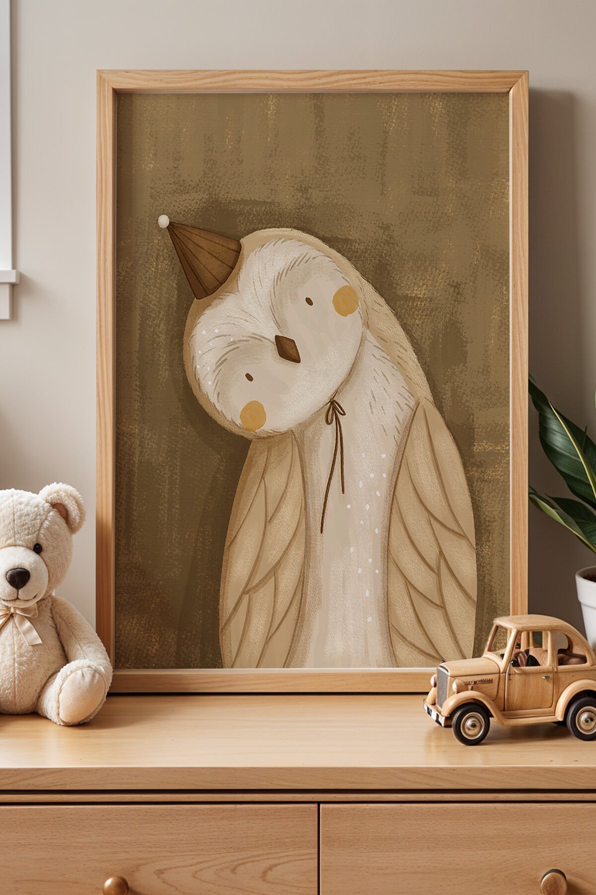 DOĞAL AHŞAP - Parti Şapkalı Baykuş Çocuk Odası Ahşap Çerçeveli Duvar Tablosu