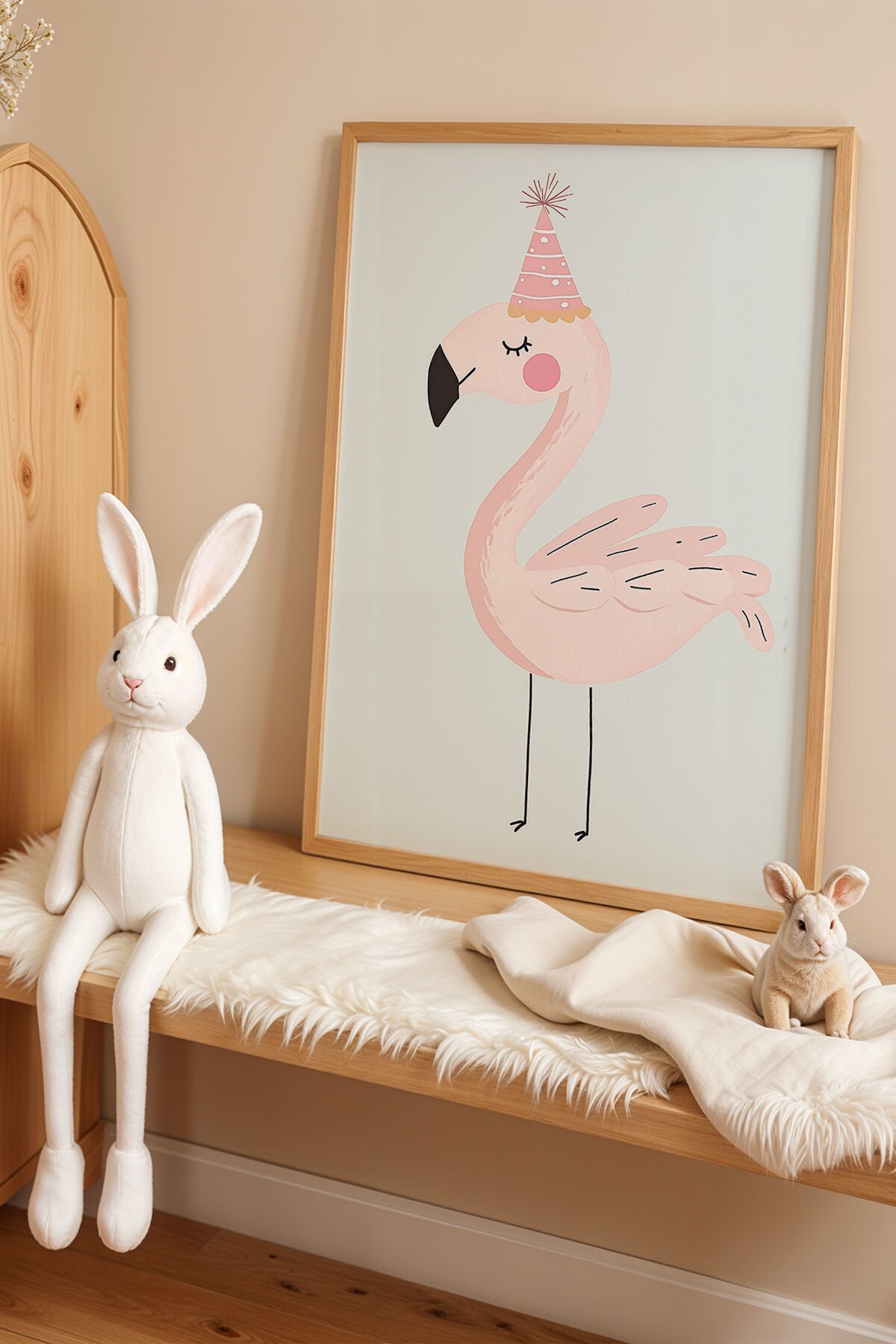 DOĞAL AHŞAP - Parti Şapkalı Flamingo - Doğal Ahşap Çerçeveli Çocuk ve Bebek Odası Tablosu