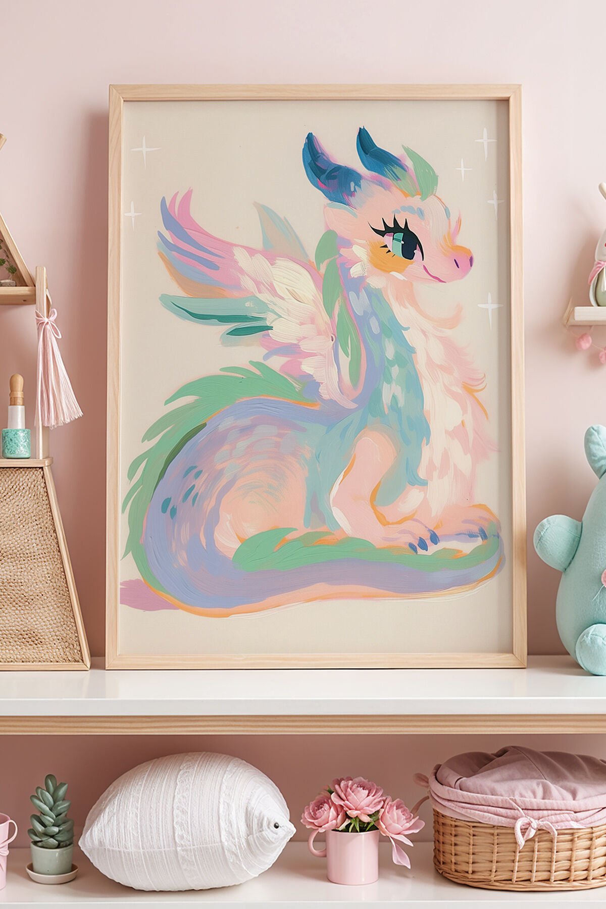 DOĞAL AHŞAP - Pastel Renkli Ejderha Çocuk Odası Ahşap Çerçeveli Duvar Tablosu