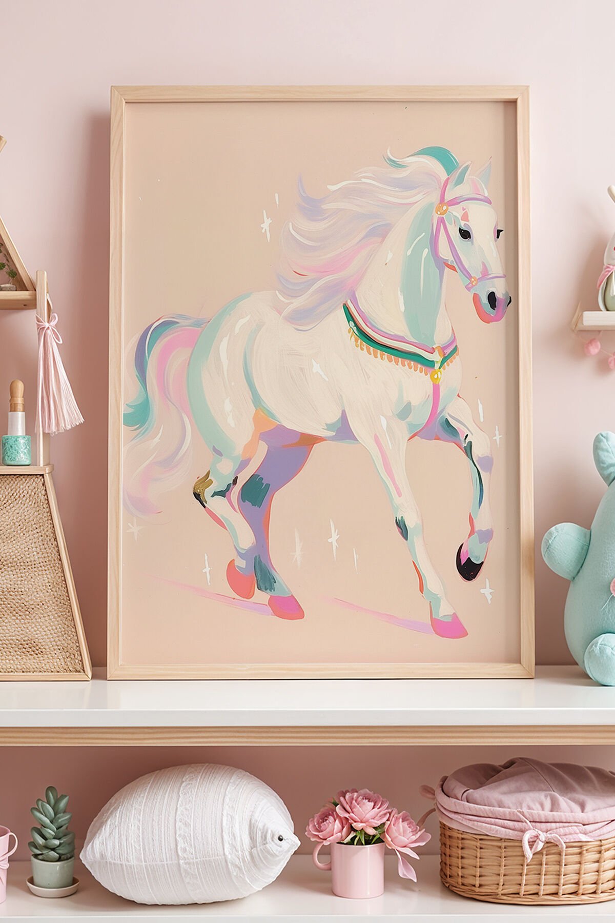 DOĞAL AHŞAP - Pastel Tonlarda Koşan Beyaz At Çocuk Odası Ahşap Çerçeveli Duvar Tablosu