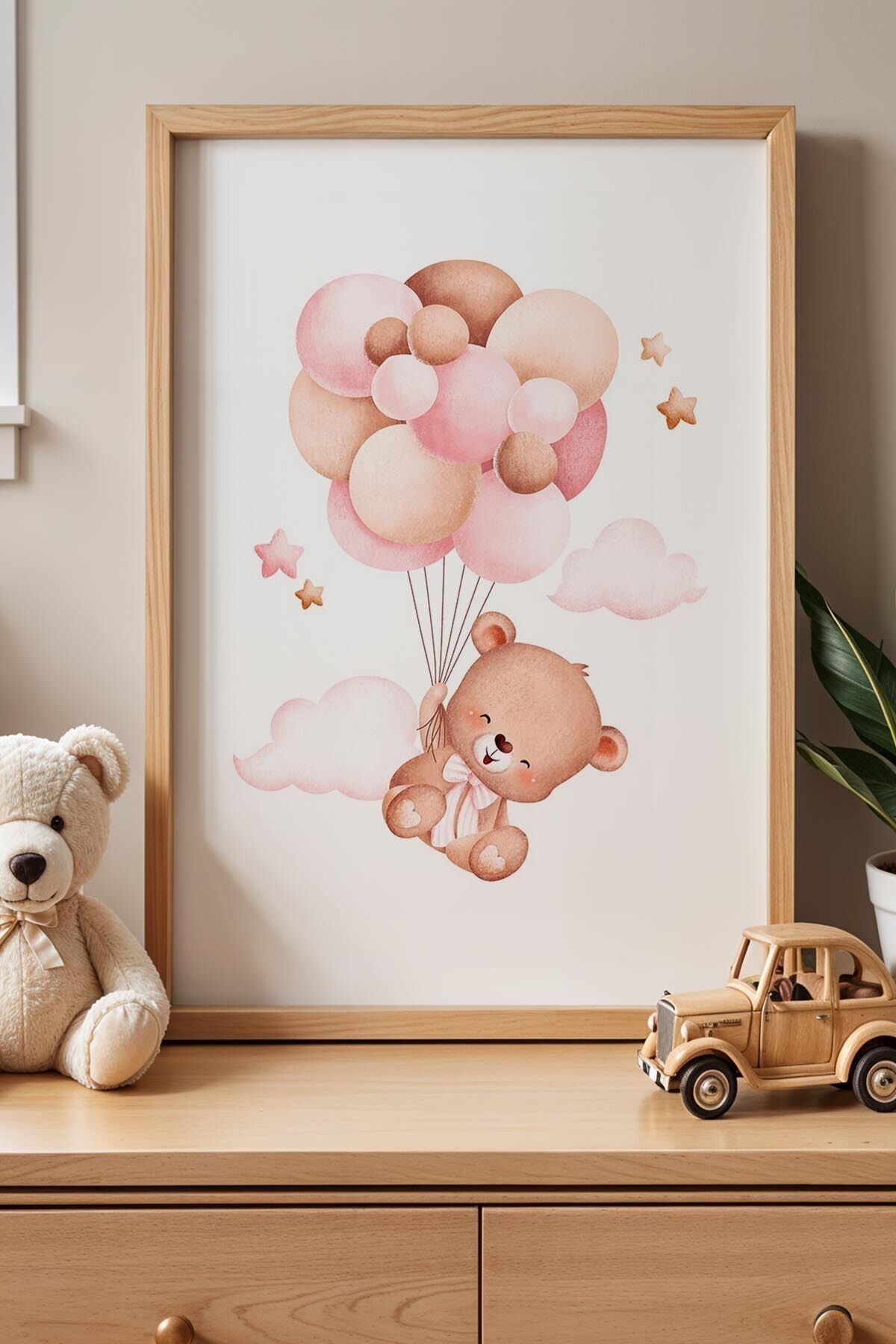 DOĞAL AHŞAP - Pembe Balon Tutan Sevimli Ayıcıklar Çocuk Odası Ahşap Çerçeveli Duvar Tablosu