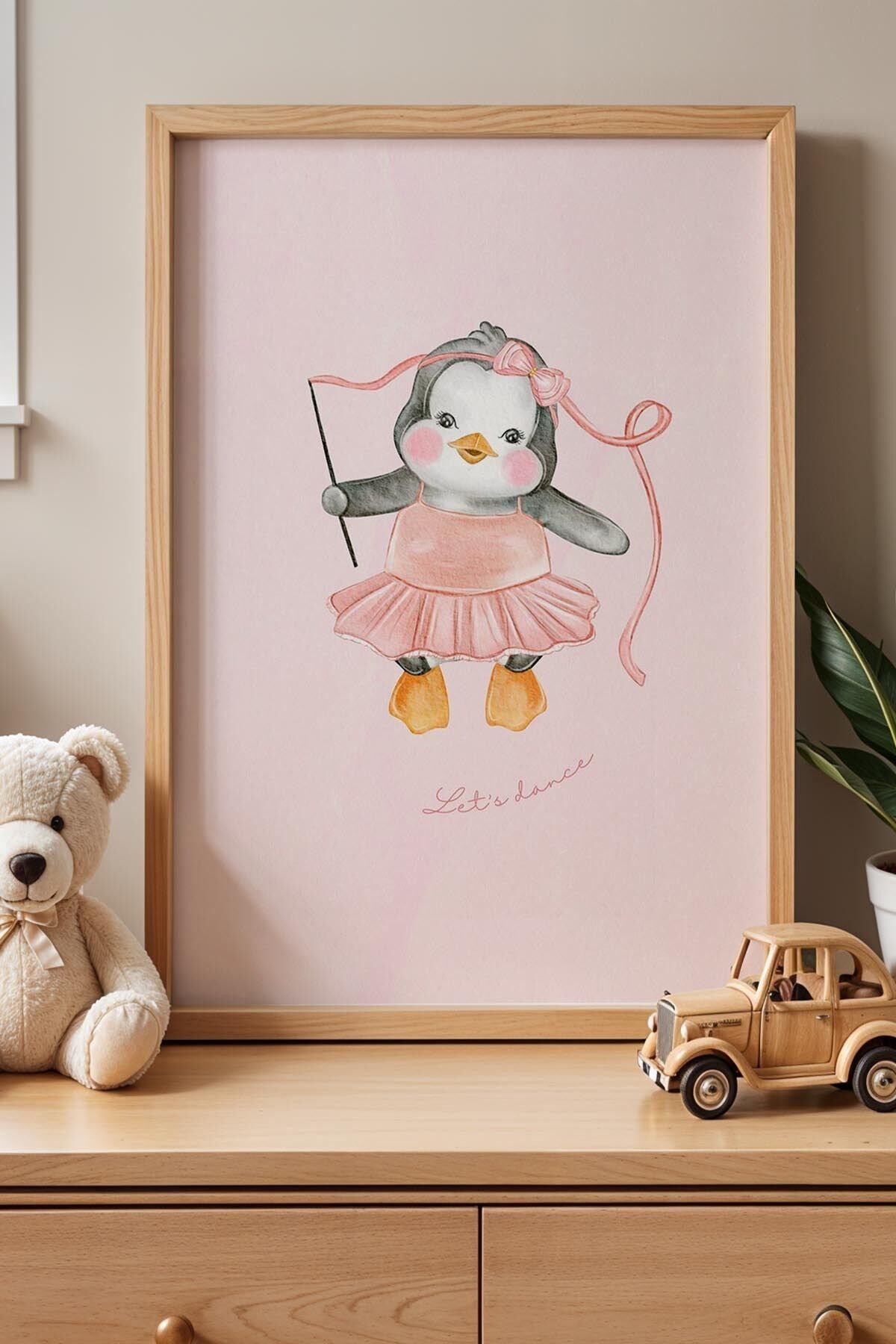DOĞAL AHŞAP - Pembe Fiyonklu Dans Eden Penguen Çocuk Odası Ahşap Çerçeveli Duvar Tablosu