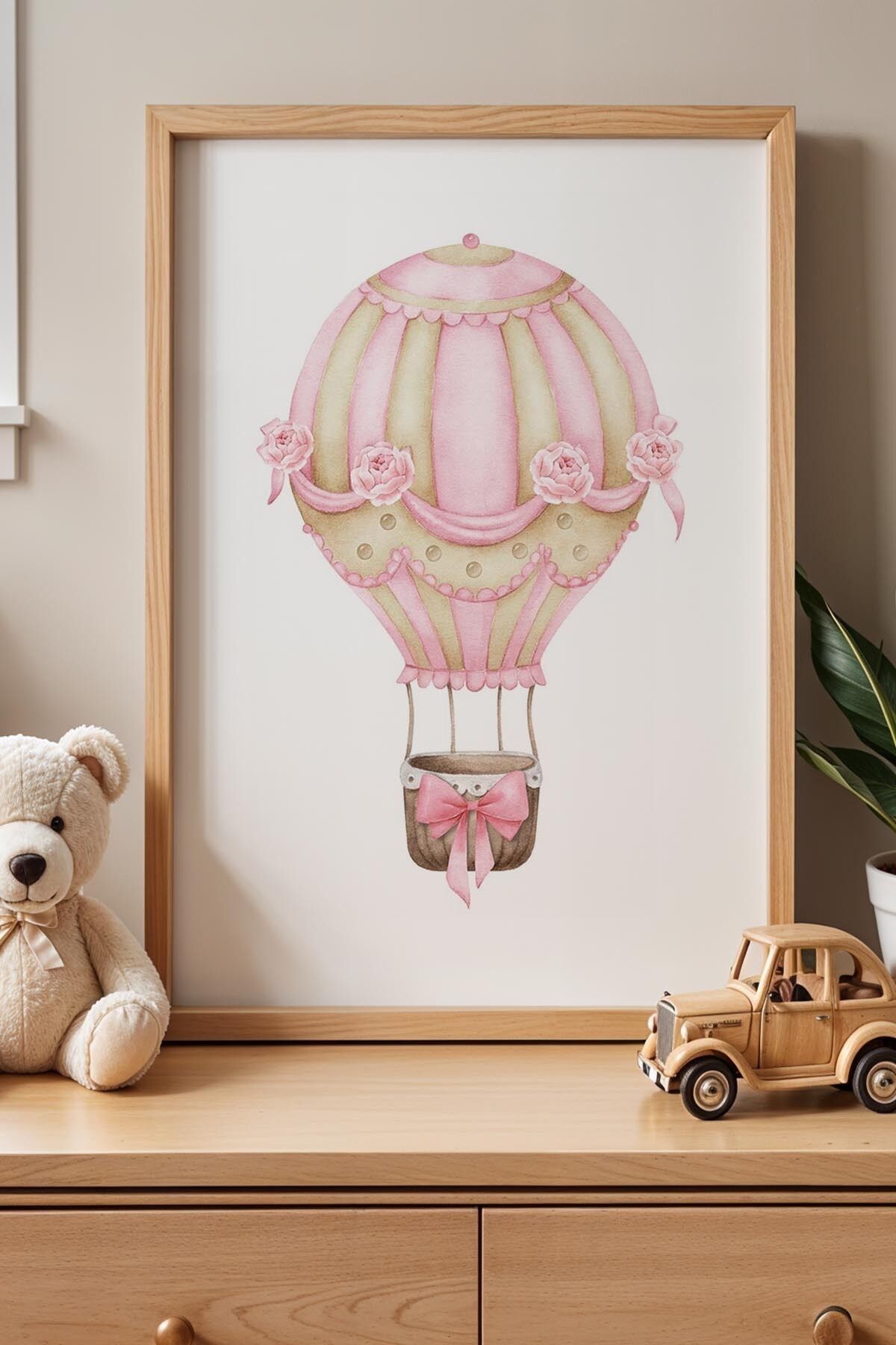 DOĞAL AHŞAP - Pembe Uçan Balon Çocuk Odası Ahşap Çerçeveli Duvar Tablosu
