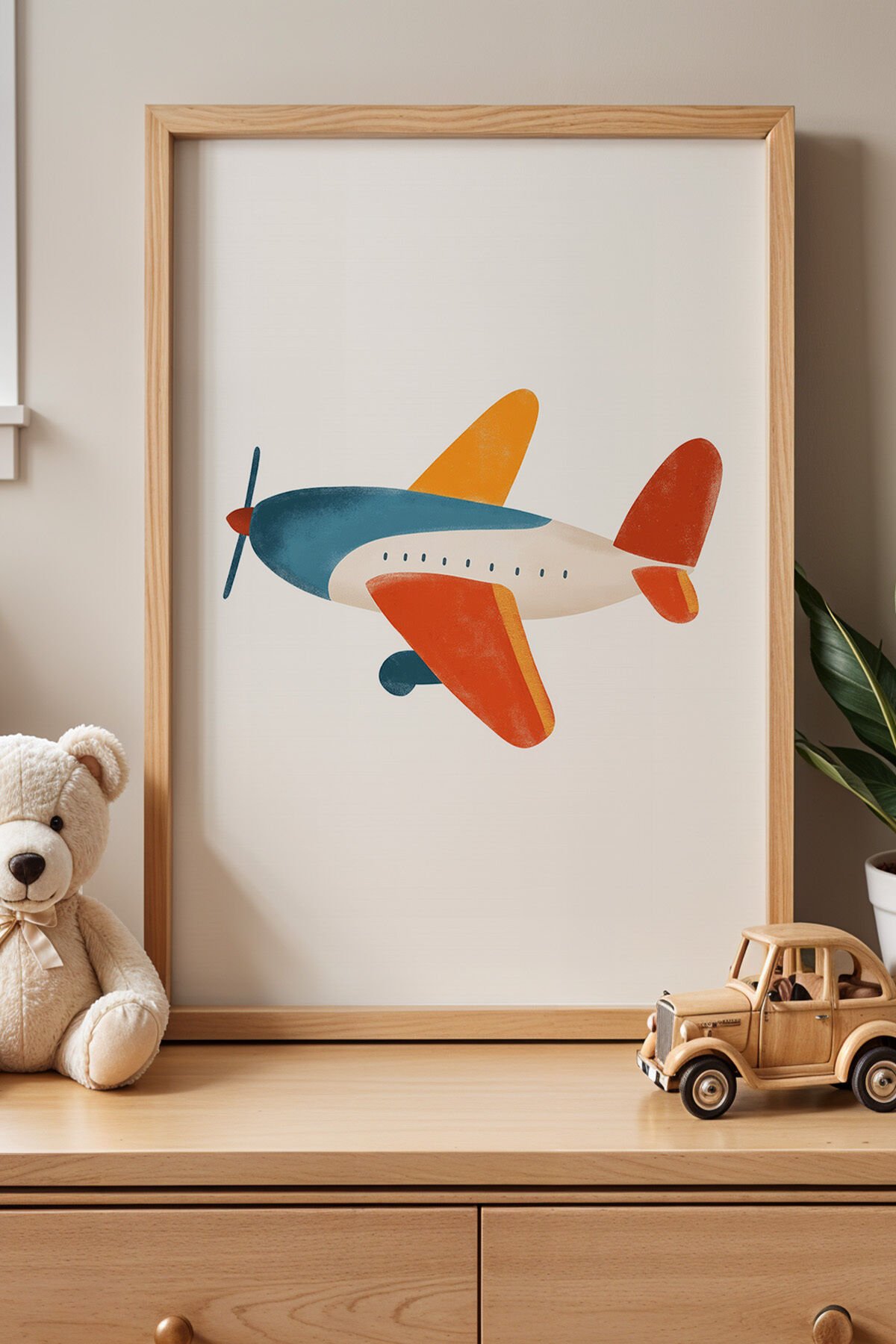 DOĞAL AHŞAP - Rengarenk Sevimli Uçak Çocuk Odası Ahşap Çerçeveli Duvar Tablosu