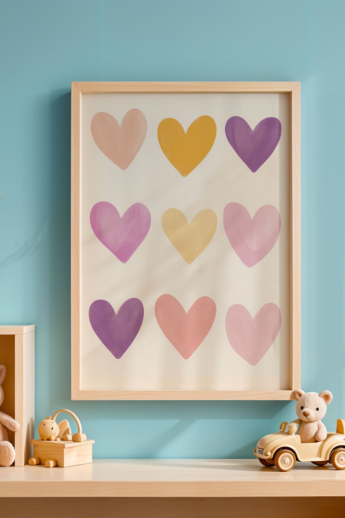 DOĞAL AHŞAP - Renkli Kalpler Çocuk Odası Ve Bebek Odası Ahşap Çerçeveli Duvar Tablosu