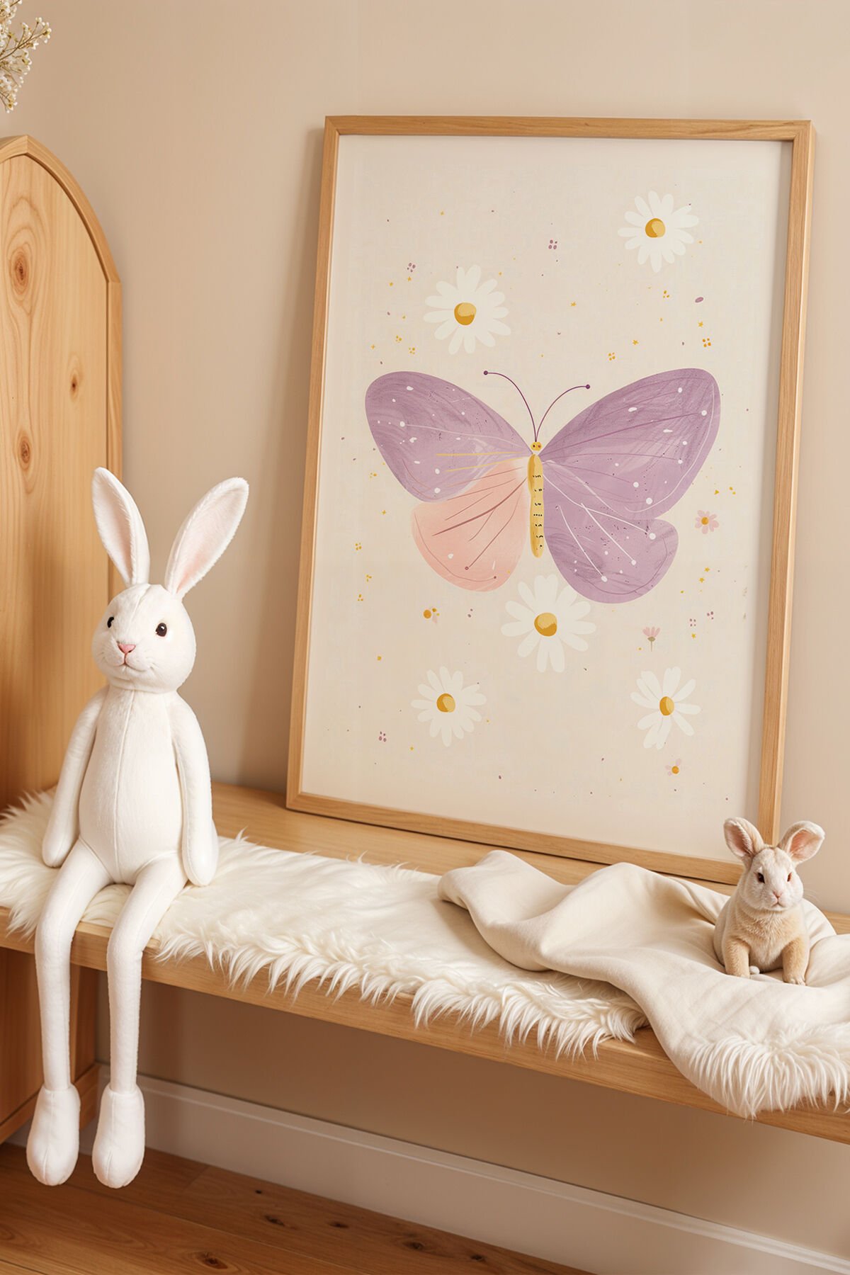 DOĞAL AHŞAP - Renkli Kelebek ve Çiçekler Doğal Ahşap Çerçeveli Çocuk ve Bebek Odası Tablosu
