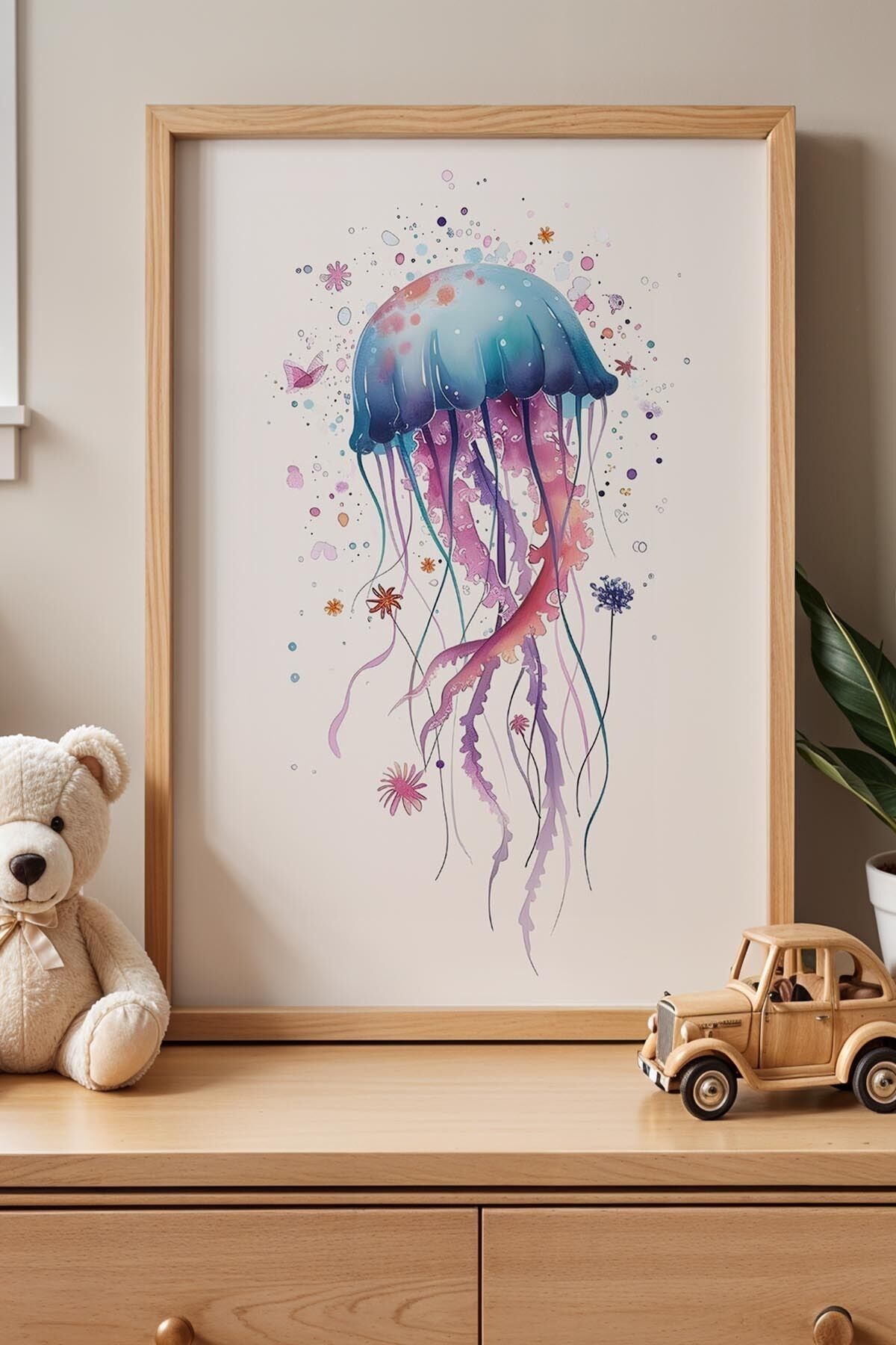 DOĞAL AHŞAP - Renkli Noktalı Büyük Denizanası Çocuk Odası Ahşap Çerçeveli Duvar Tablosu