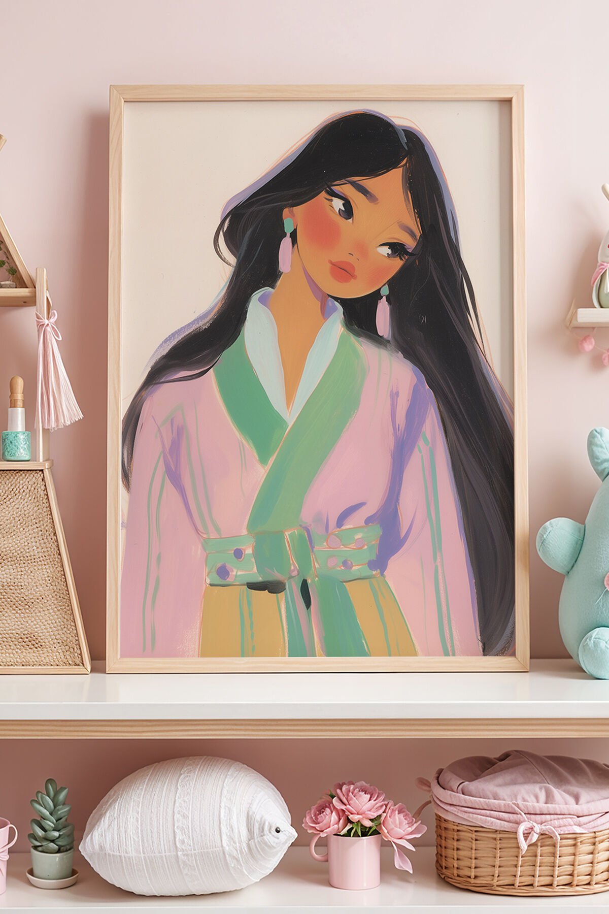 DOĞAL AHŞAP - Renkli Tüy Küpeli Kız İllüstrasyonu Çocuk Odası Ahşap Çerçeveli Duvar Tablosu