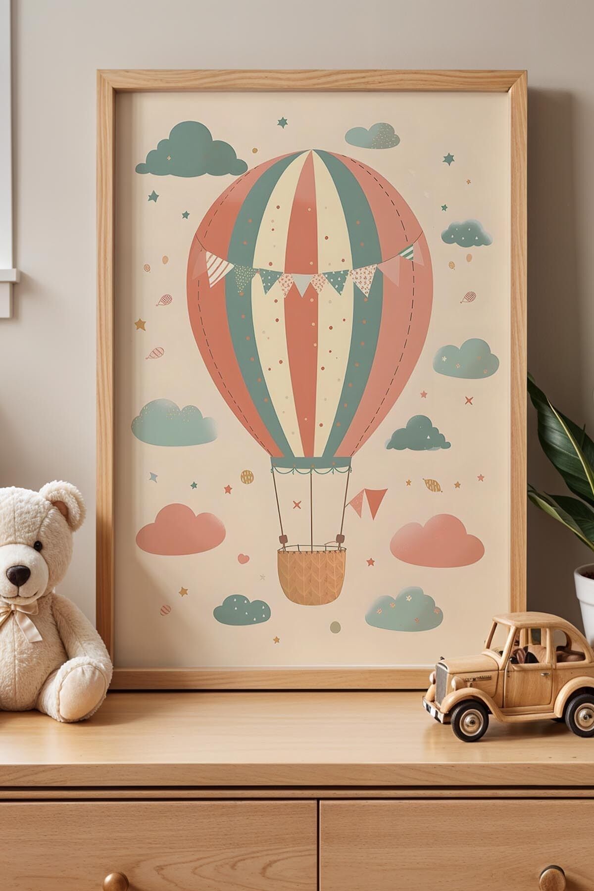 DOĞAL AHŞAP - Renkli Uçan Balon Temalı Çocuk Odası Ahşap Çerçeveli Duvar Tablosu