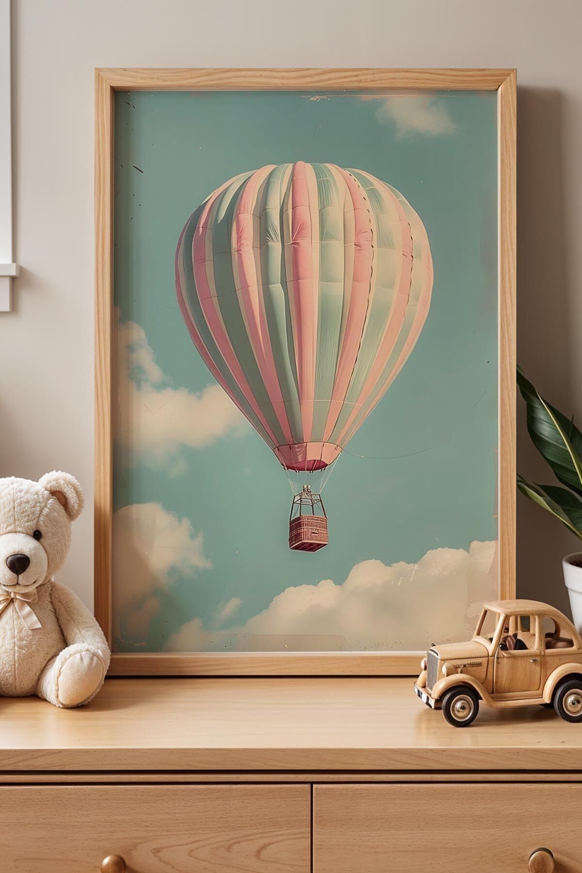 DOĞAL AHŞAP - Retro Çizim Uçan Balon Çocuk Odası Ahşap Çerçeveli Duvar Tablosu