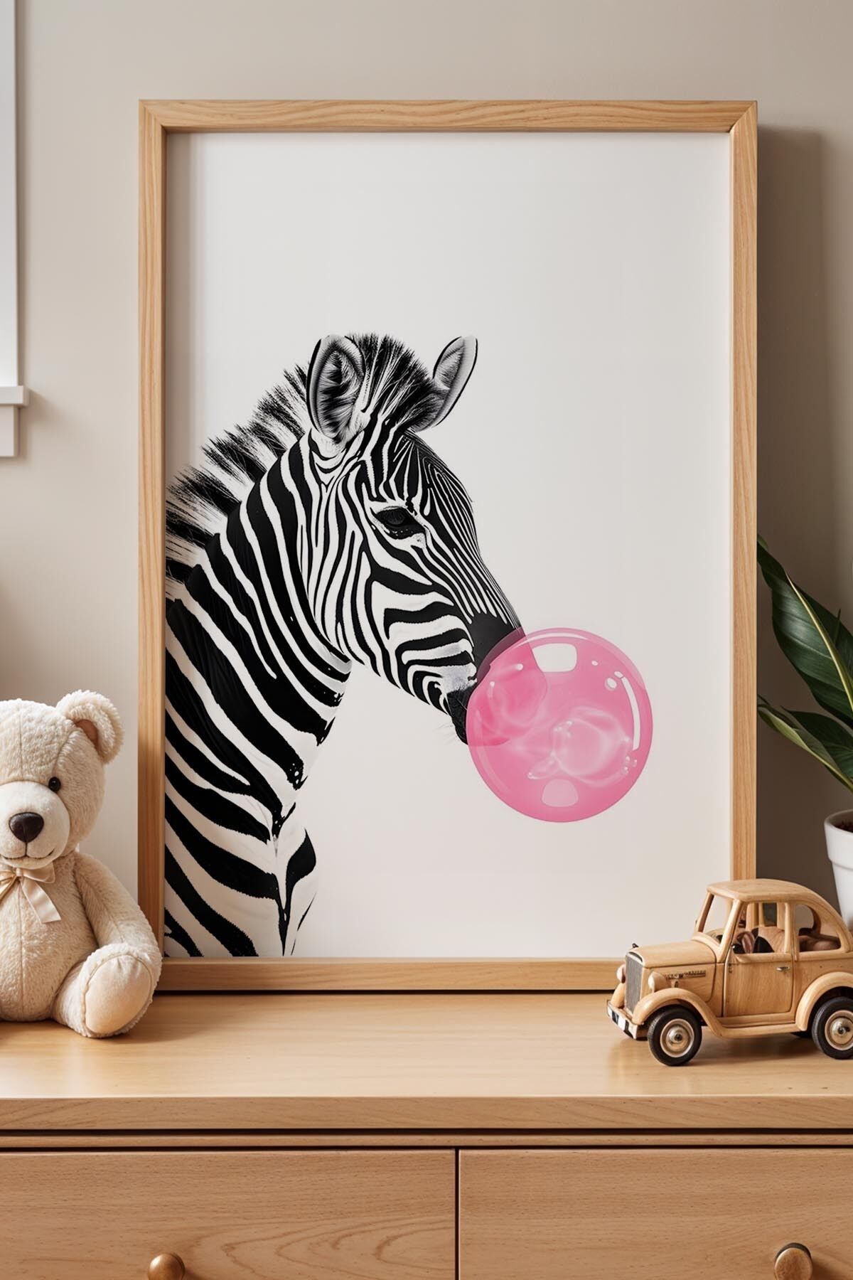 DOĞAL AHŞAP - Sakız Balonu Üfleyen Zebra Tasarımlı Çocuk Odası Ahşap Çerçeveli Duvar Tablosu