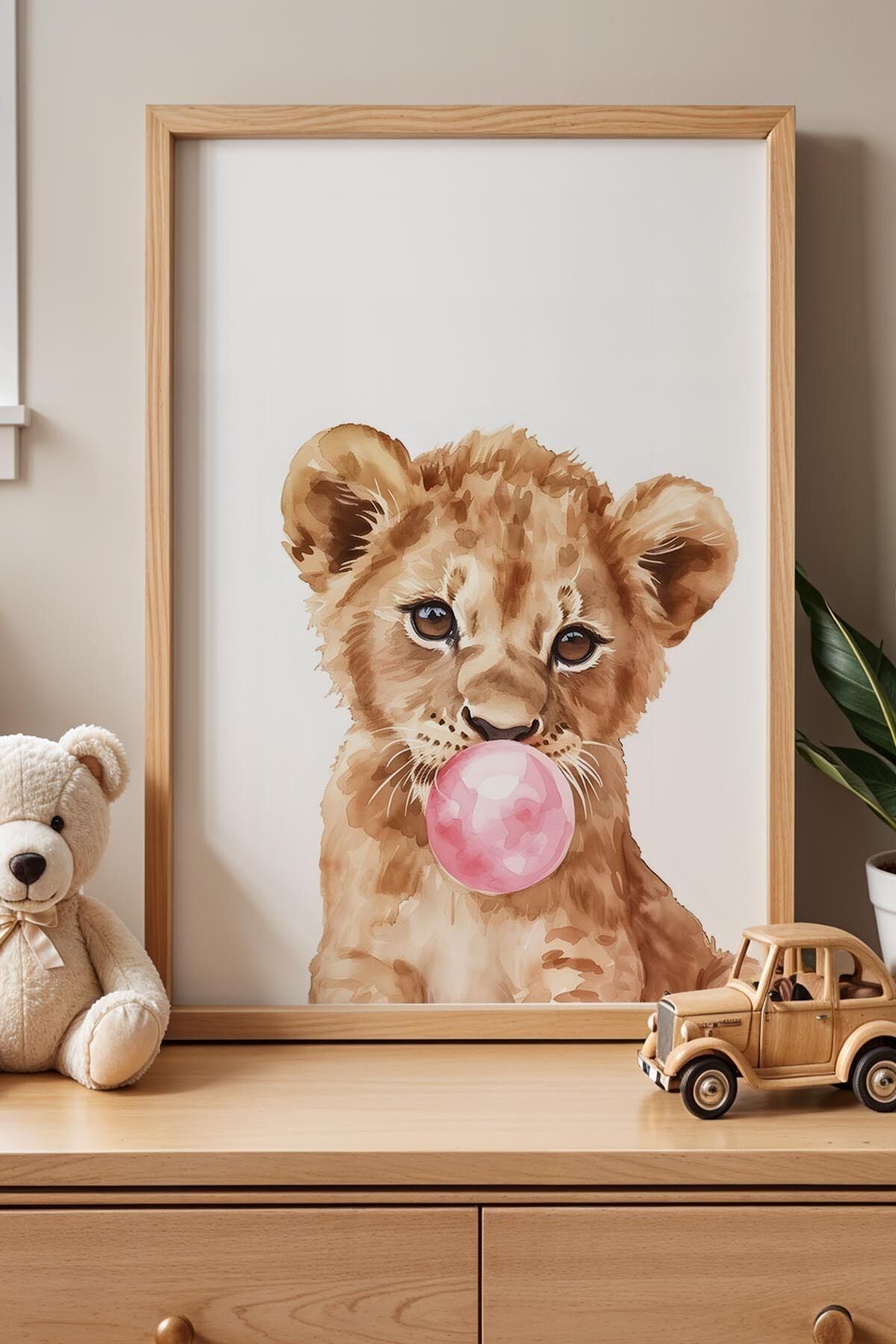 DOĞAL AHŞAP - Sakız Çiğneyen Yavru Aslan Çocuk Odası Ahşap Çerçeveli Duvar Tablosu