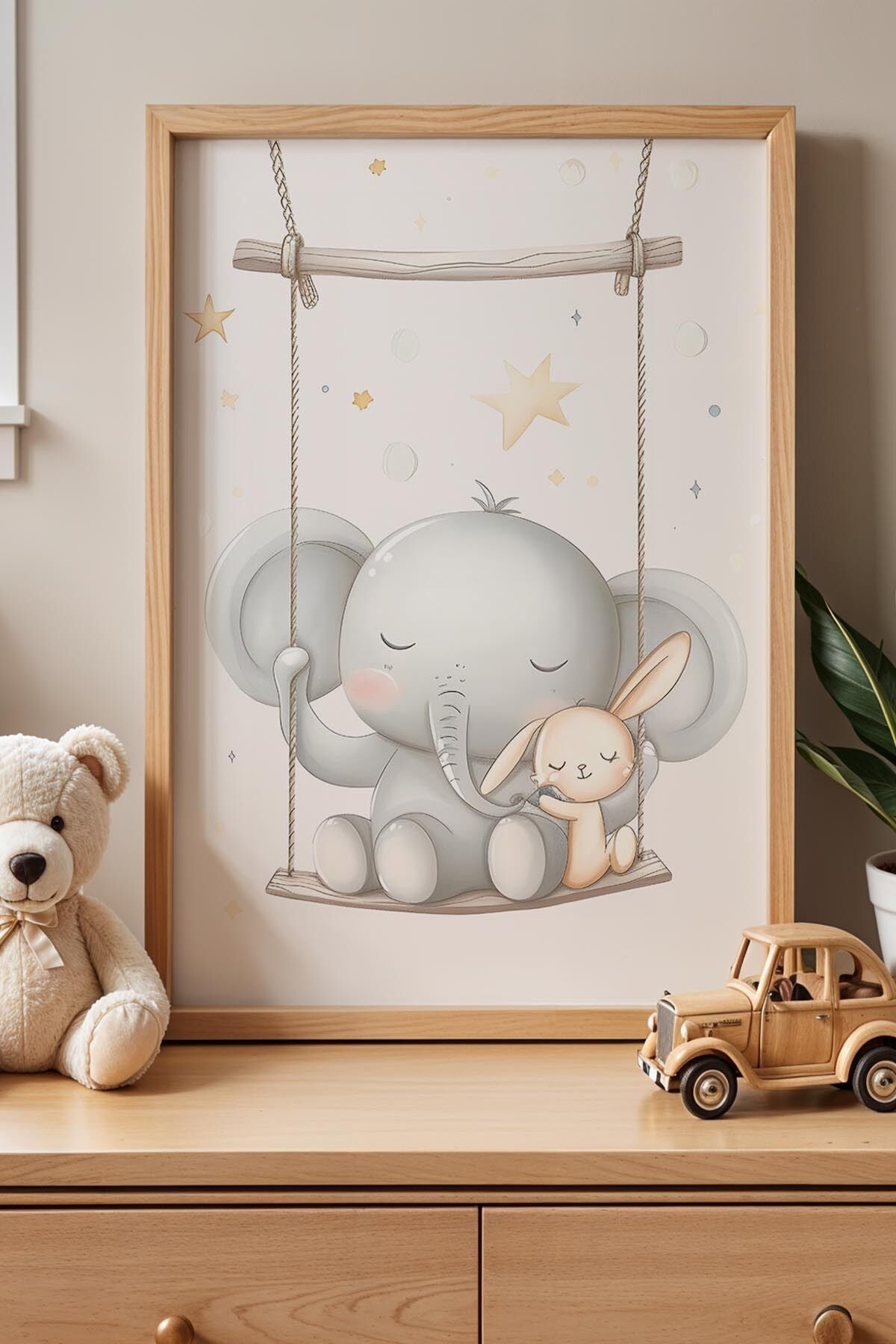DOĞAL AHŞAP - Salıncakta Sallanan Sevimli Fil Çocuk Odası Ahşap Çerçeveli Duvar Tablosu