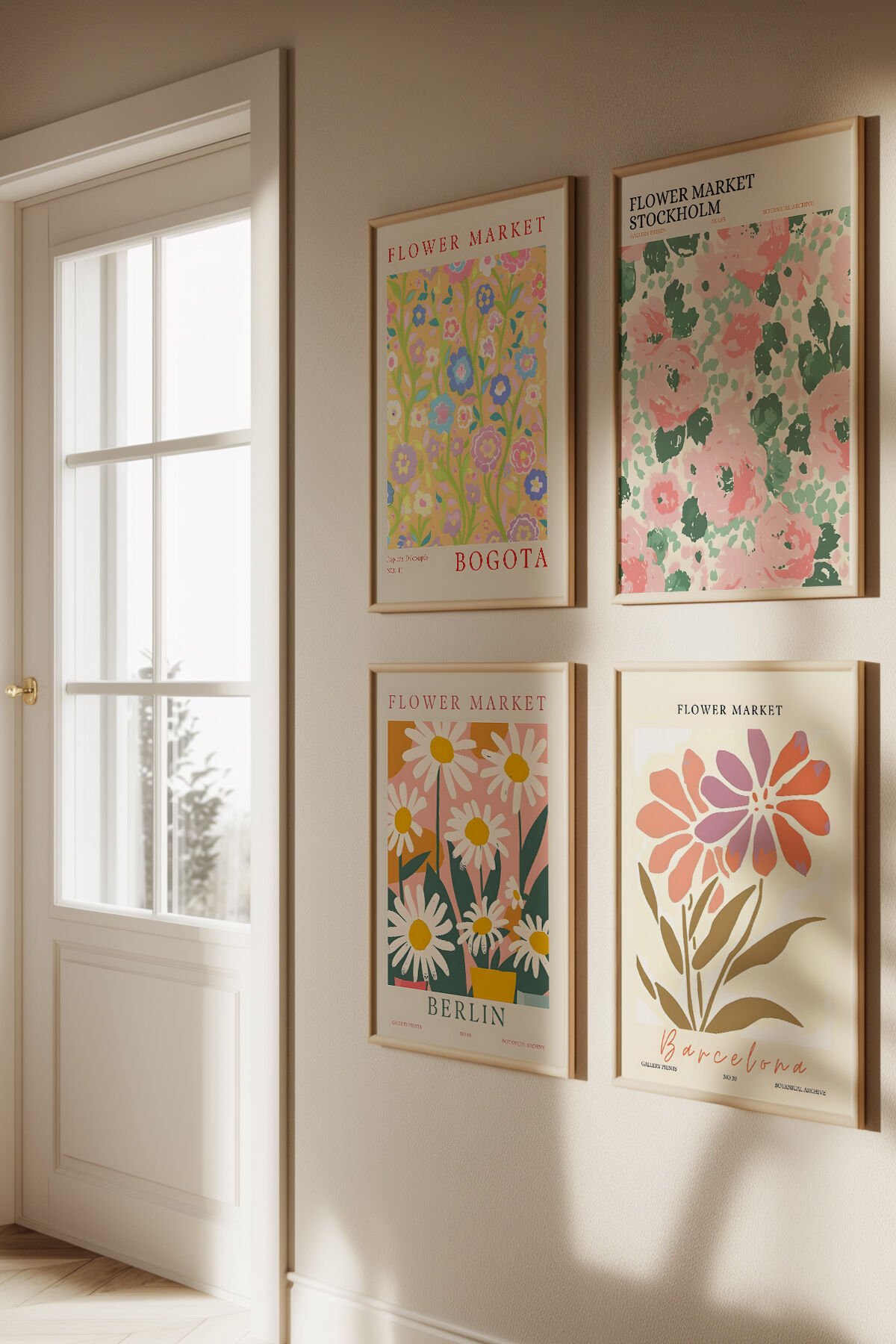 DOĞAL AHŞAP - Sanatsal Floral Harmoni - Bogota, Stockholm, Berlin, Barcelona 4'lü Minimalist Tablo Seti