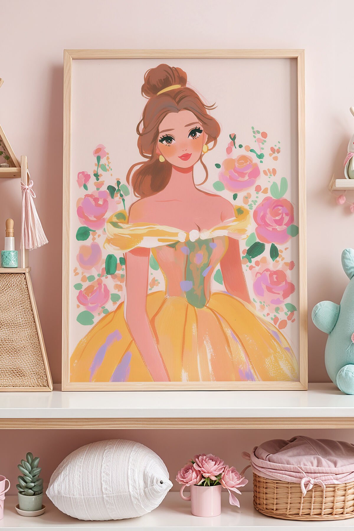 DOĞAL AHŞAP - Sarı Elbiseli Gül Bahçesi Prensesi Çocuk Odası Ahşap Çerçeveli Duvar Tablosu