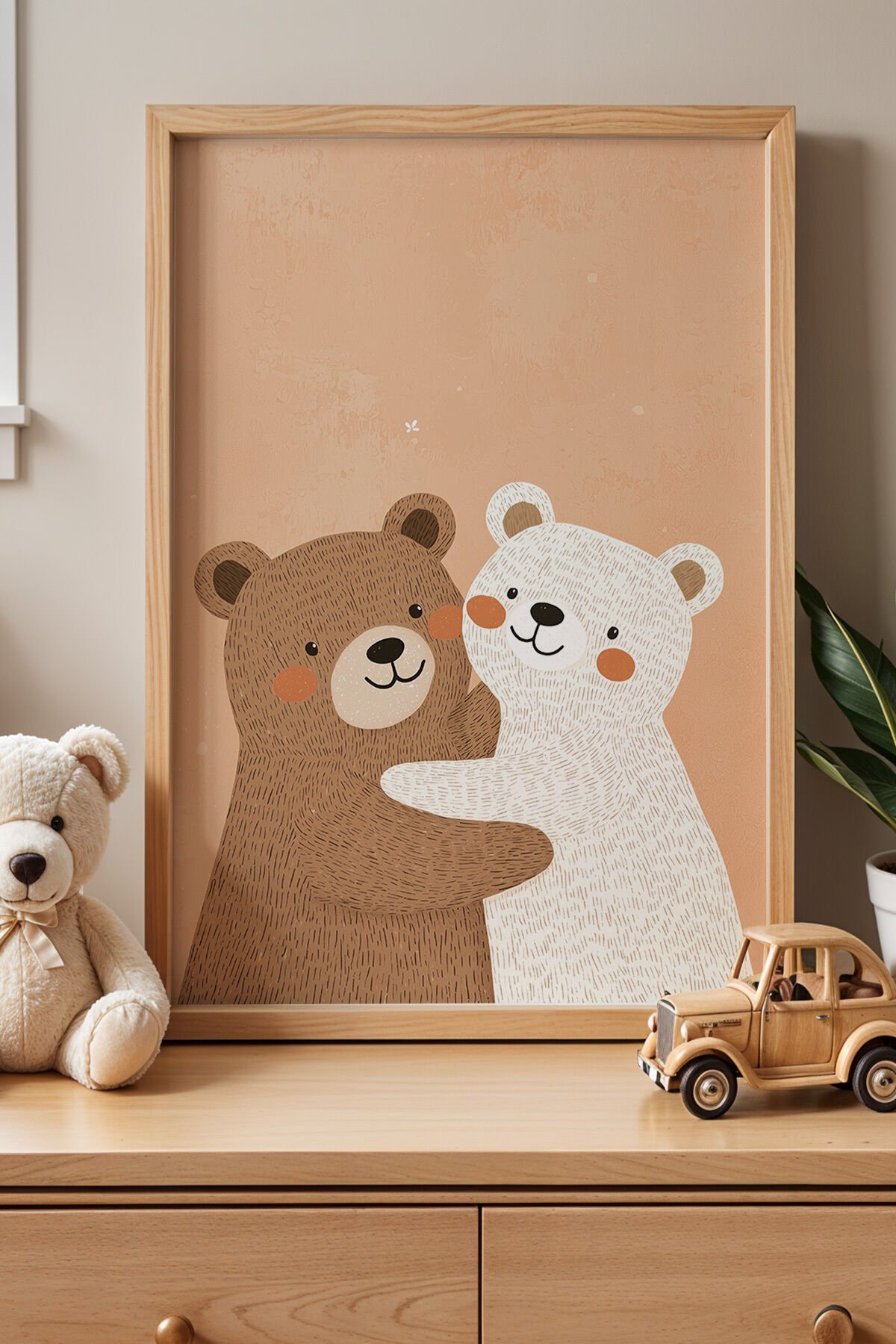 DOĞAL AHŞAP - Sarılmış Sevimli Ayılar Doğal Ahşap Çerçeveli Çocuk ve Bebek Odası Tablosu