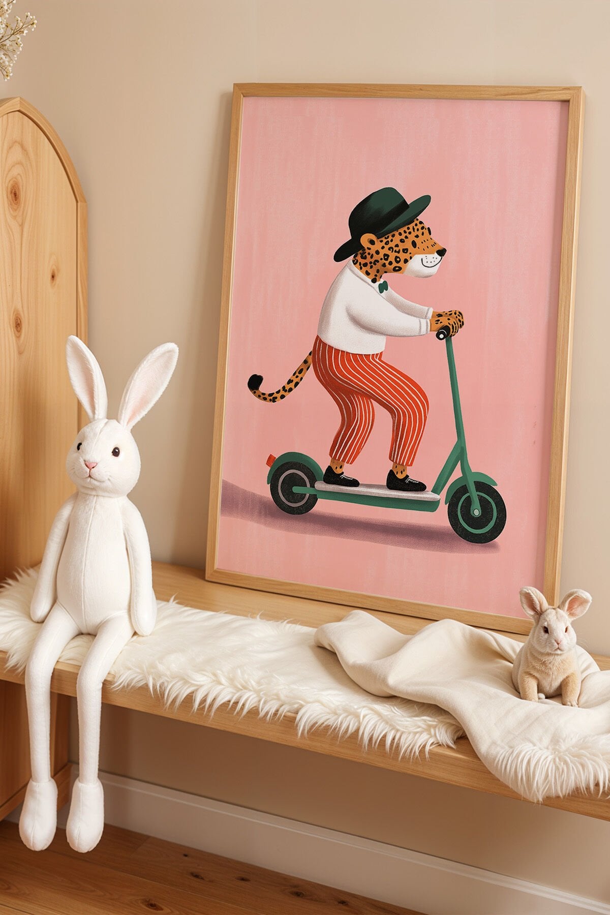 DOĞAL AHŞAP - Scooter Süren Leopar Çocuk Odası Ahşap Çerçeveli Duvar Tablosu