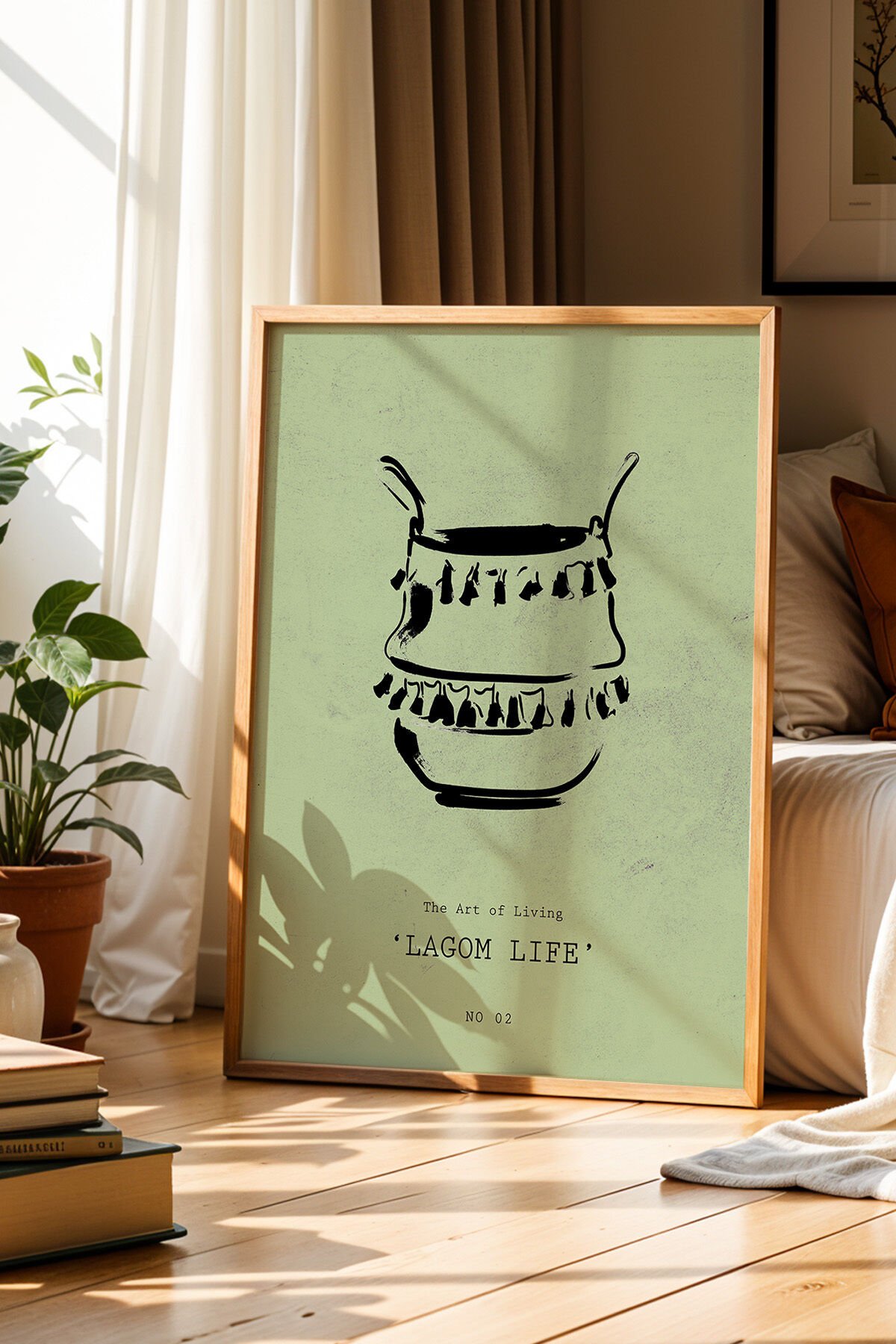DOĞAL AHŞAP - Sepet Çizimi Bohem Minimalist Yeşil Doğal Ahşap Çerçeveli Duvar Tablosu