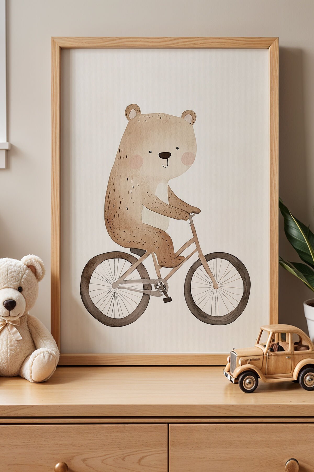 DOĞAL AHŞAP - Sevimli Bisiklet Süren Ayı Çocuk Odası Ve Bebek Odası Ahşap Çerçeveli Duvar Tablosu