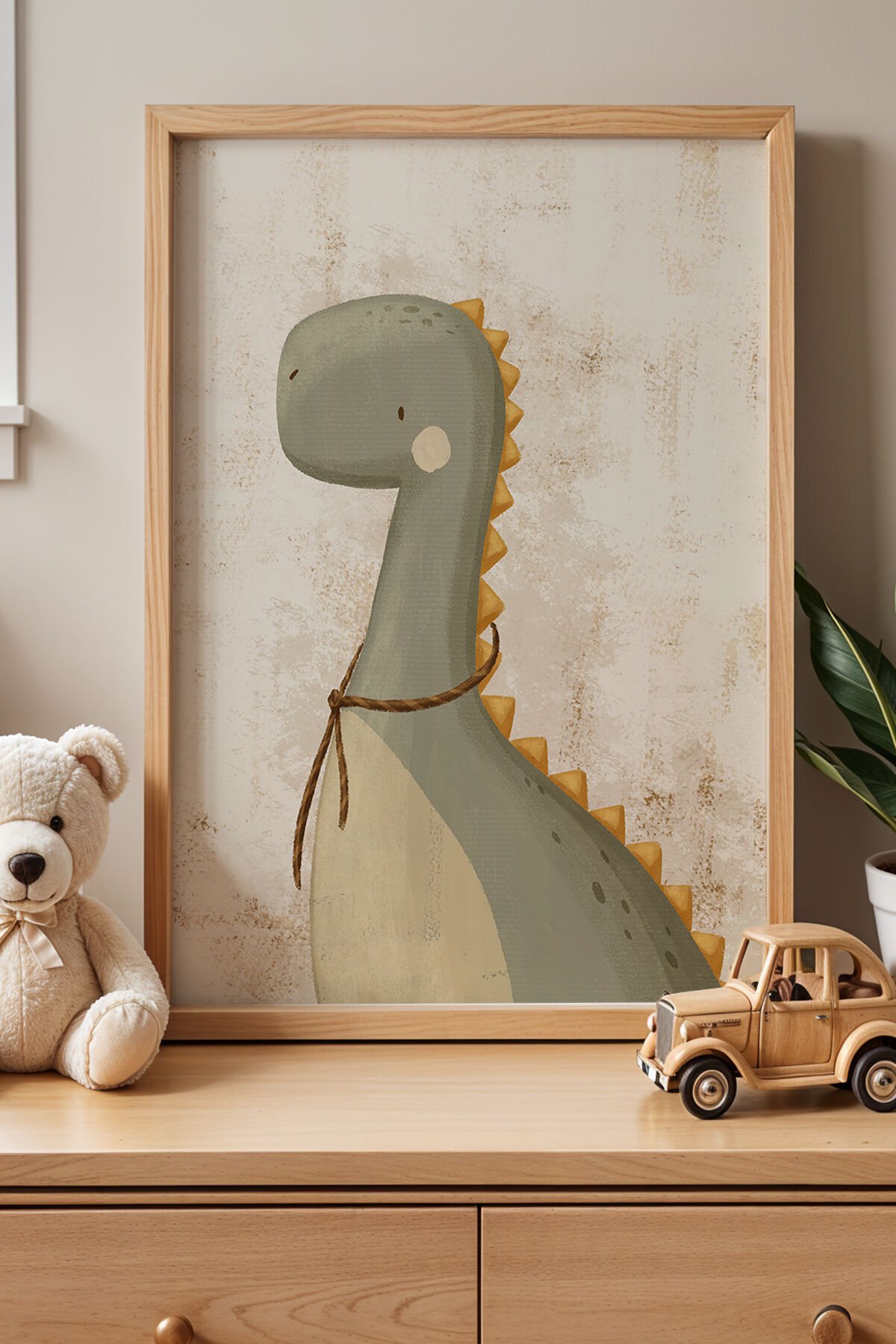 DOĞAL AHŞAP - Sevimli Dinazor Çocuk Odası Ahşap Çerçeveli Duvar Tablosu