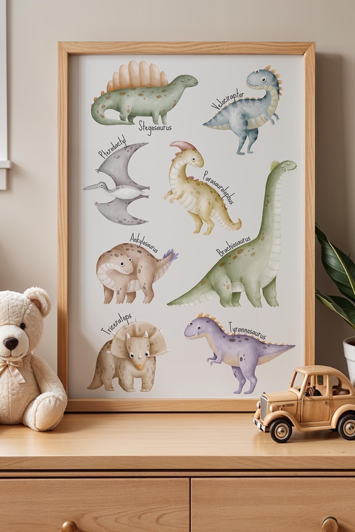 DOĞAL AHŞAP - Sevimli Dinazorlar Öğretici Çocuk Odası Ahşap Çerçeveli Duvar Tablosu