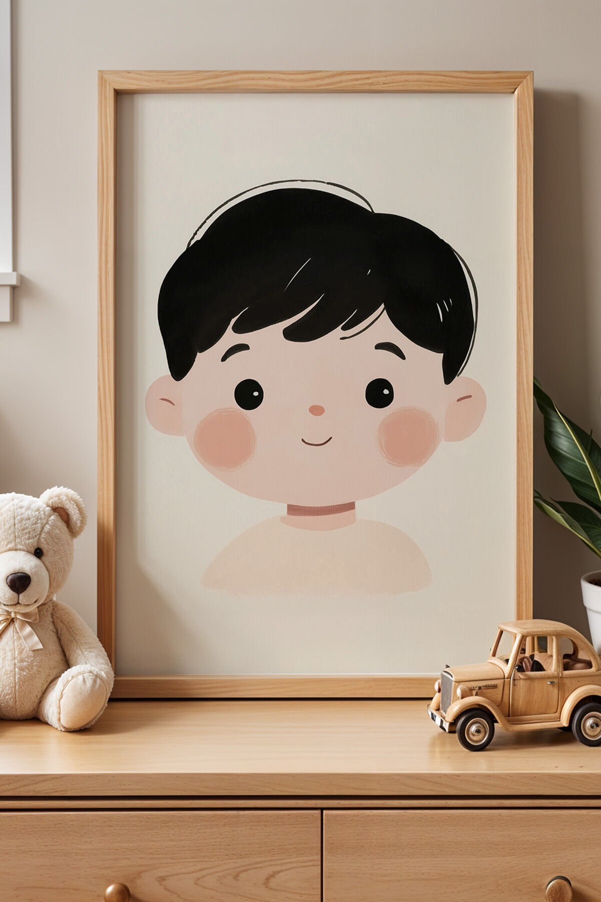 DOĞAL AHŞAP - Sevimli Erkek Çocuk Portresi - Doğal Ahşap Çerçeveli Çocuk ve Bebek Odası Tablosu