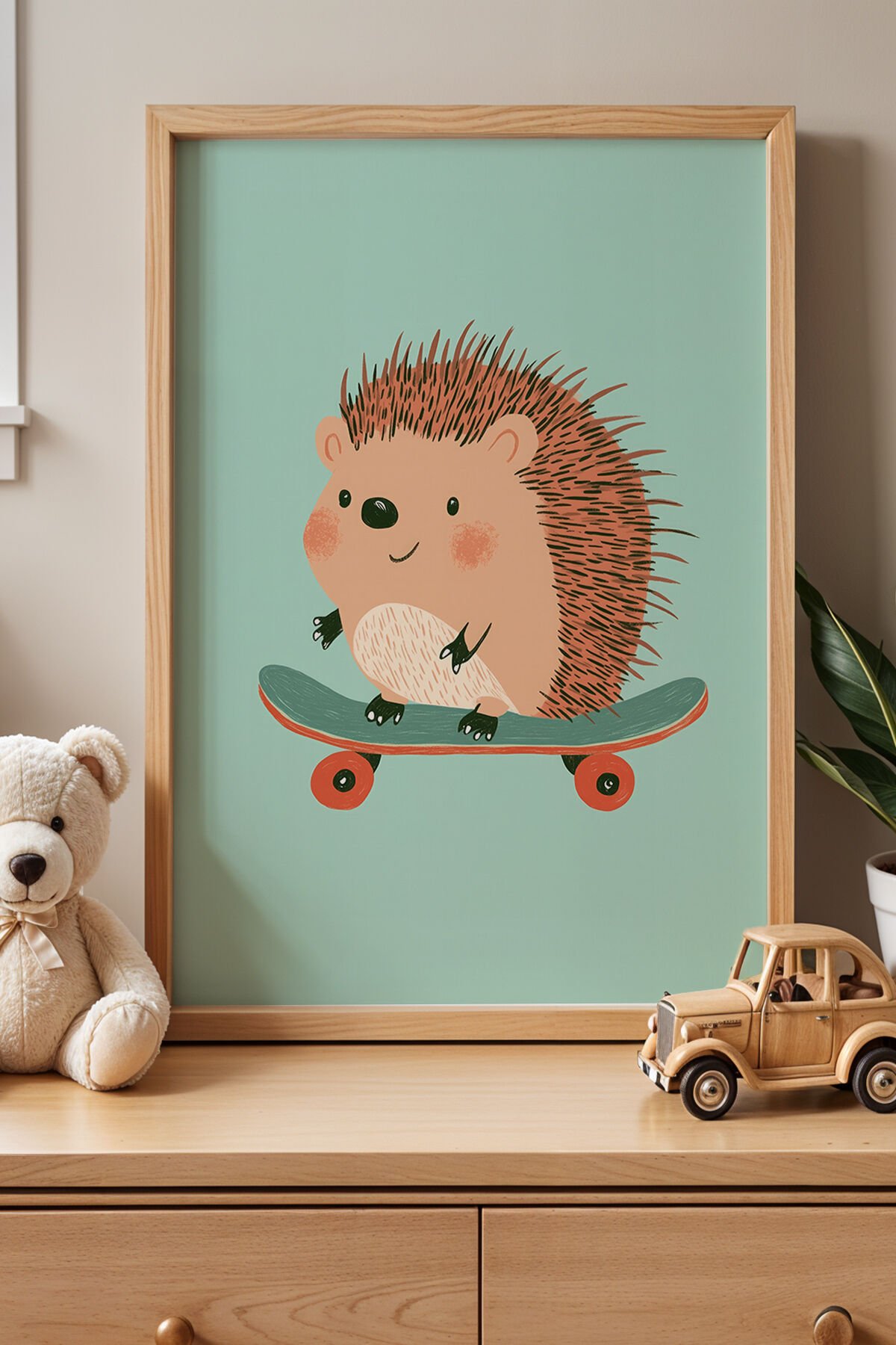 DOĞAL AHŞAP - Sevimli KayKaycı Kirpi Çocuk Odası Ve Bebek Odası Ahşap Çerçeveli Duvar Tablosu