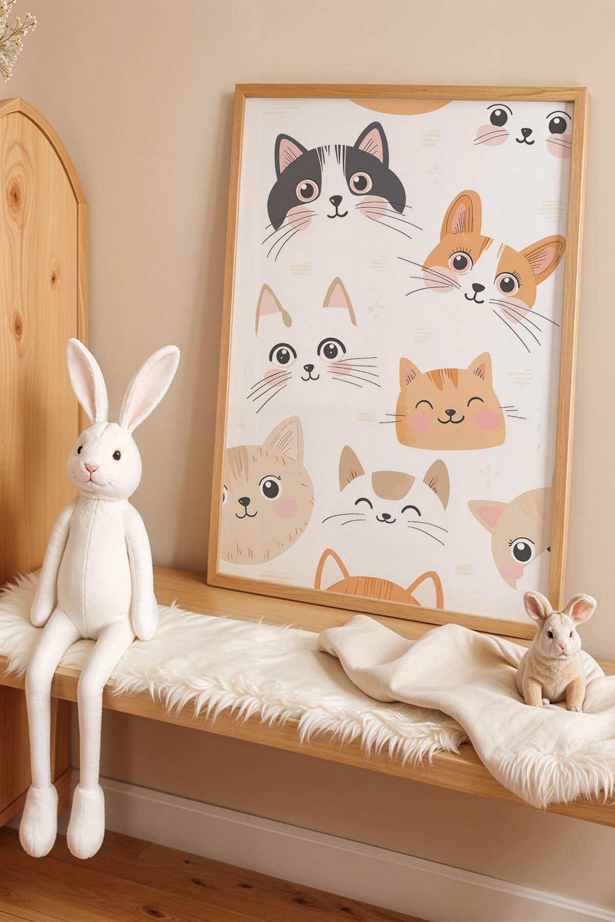 DOĞAL AHŞAP - Sevimli Kedi Yüzleri Doğal Ahşap Çerçeveli Çocuk Odası Tablosu