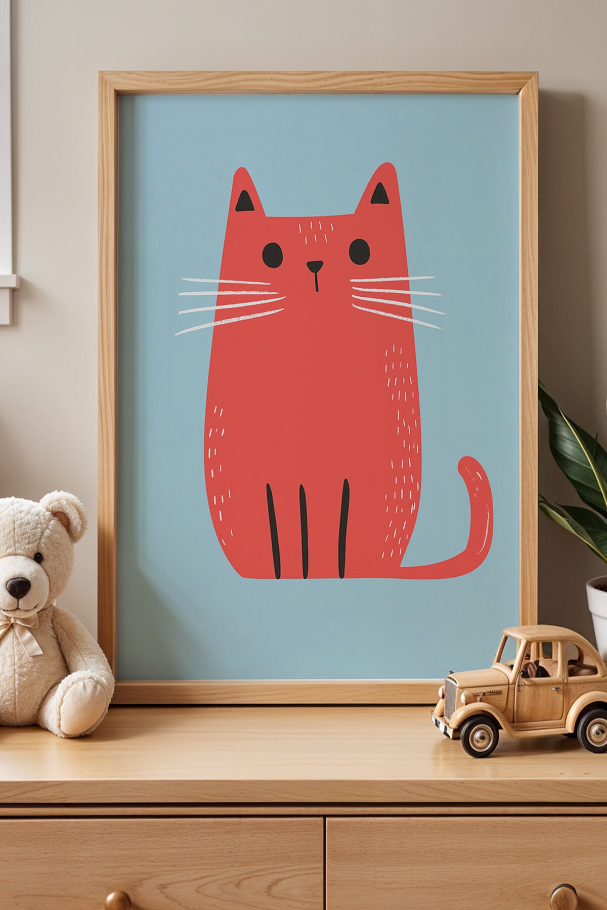 DOĞAL AHŞAP - Sevimli Kırmızı Kedi Çocuk Odası Ahşap Çerçeveli Duvar Tablosu